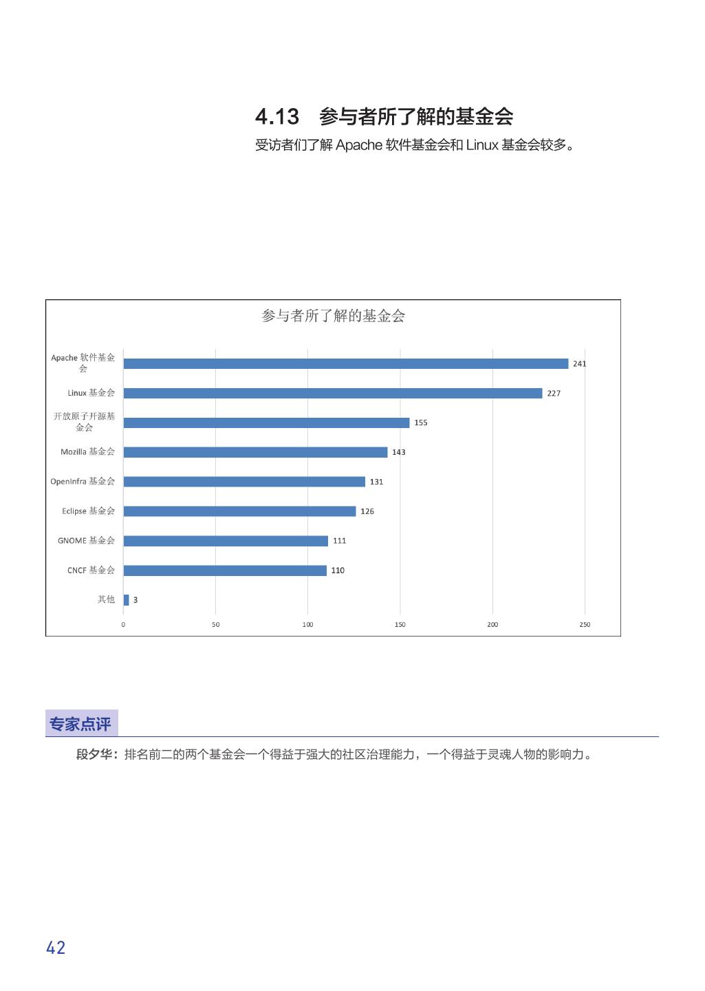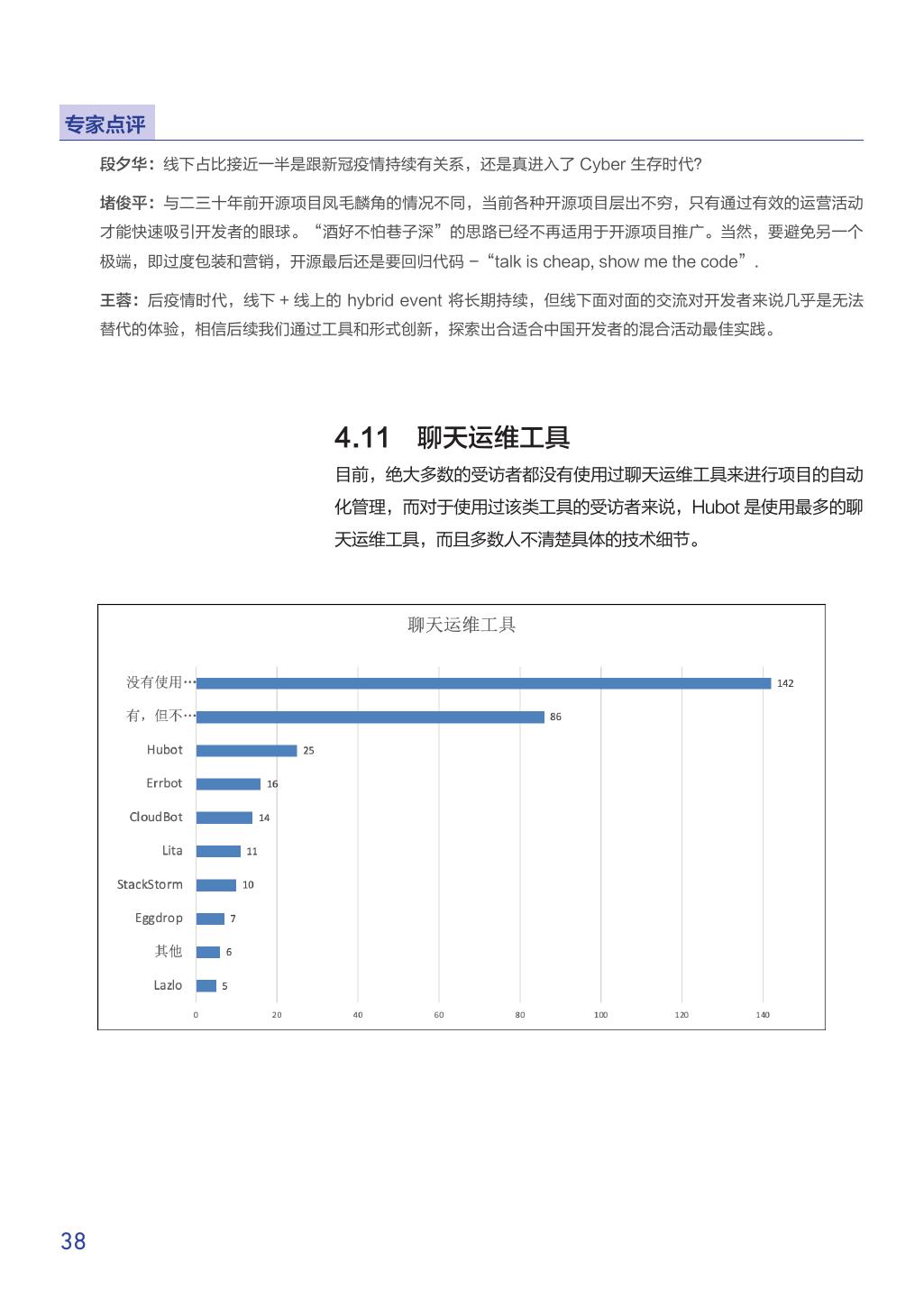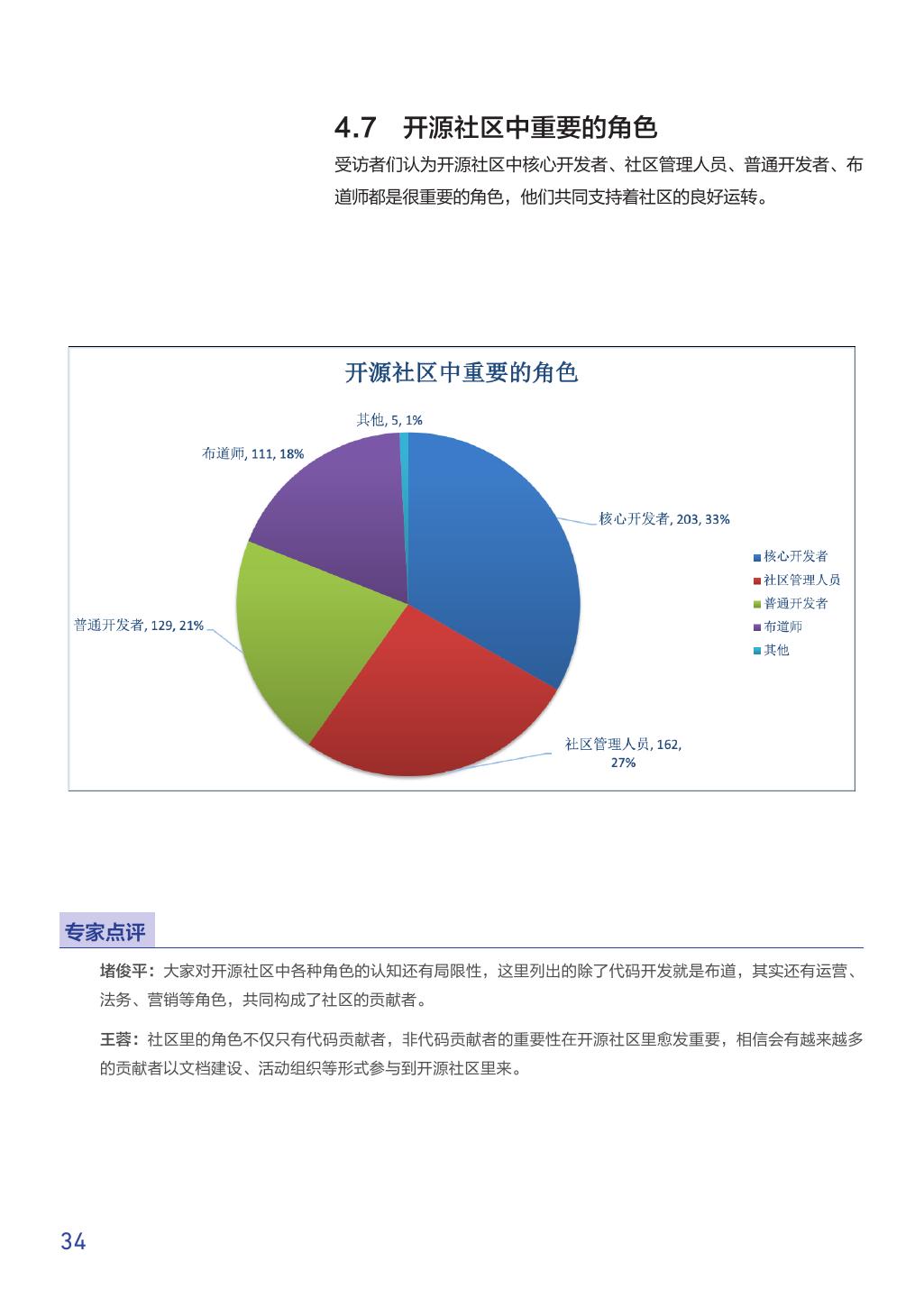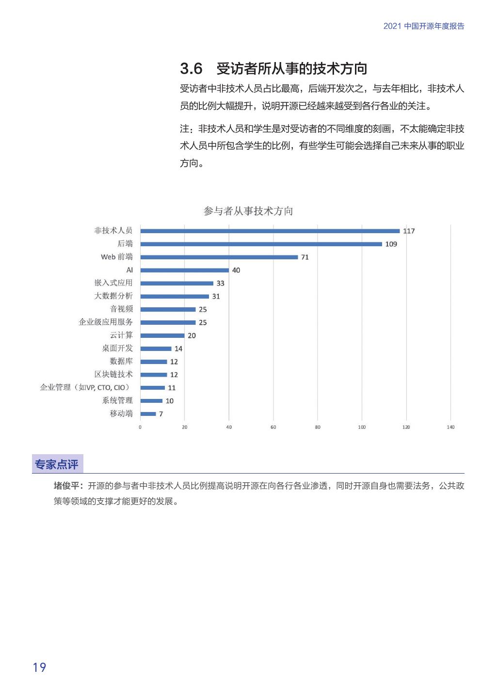 19 . 2021 中国开源年度报告 3.6 受访者所从事的技术方向 受访者中非技术人员占比最高,后端开发次之,与去年相比,非技术人 员的比例大幅提升,说明开源已经越来越受到各行各业的关注。 注:非技术人员和学生是对受访者的不同维度的刻画,不太能确定非技 术人员中所包含学生的比例,有些学生可能会选择自己未来从事的职业 方向。 专家点评 堵俊平:开源的参与者中非技术人员比例提高说明开源在向各行各业渗透,同时开源自身也需要法务,公共政 策等领域的支撑才能更好的发展。 19