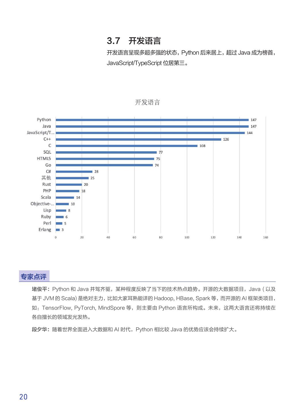 20 . 3.7 开发语言 开发语言呈现多超多强的状态,Python 后来居上,超过 Java 成为榜首, JavaScript/TypeScript 位居第三。 专家点评 堵俊平:Python 和 Java 并驾齐驱,某种程度反映了当下的技术热点趋势。开源的大数据项目,Java ( 以及 基于 JVM 的 Scala) 是绝对主力,比如大家耳熟能详的 Hadoop, HBase, Spark 等,而开源的 AI 框架类项目, 如:TensorFlow, PyTorch, MindSpore 等,则主要由 Python 语言所构成。未来,这两大语言还将持续在 各自擅长的领域发光发热。 段夕华:随着世界全面进入大数据和 AI 时代,Python 相比较 Java 的优势应该会持续扩大。 20
