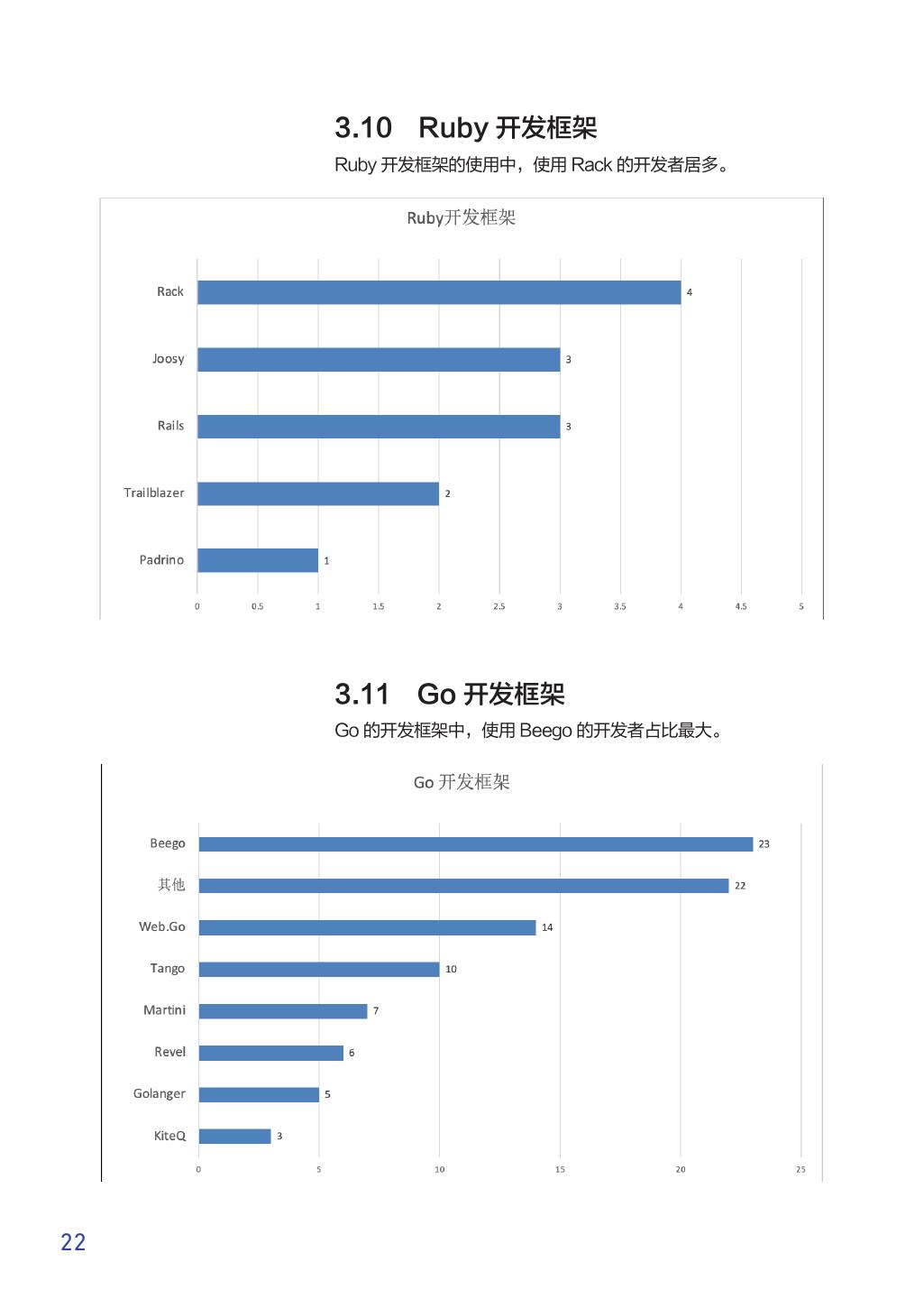 22 . 3.10 Ruby 开发框架 Ruby 开发框架的使用中,使用 Rack 的开发者居多。 3.11 Go 开发框架 Go 的开发框架中,使用 Beego 的开发者占比最大。 22