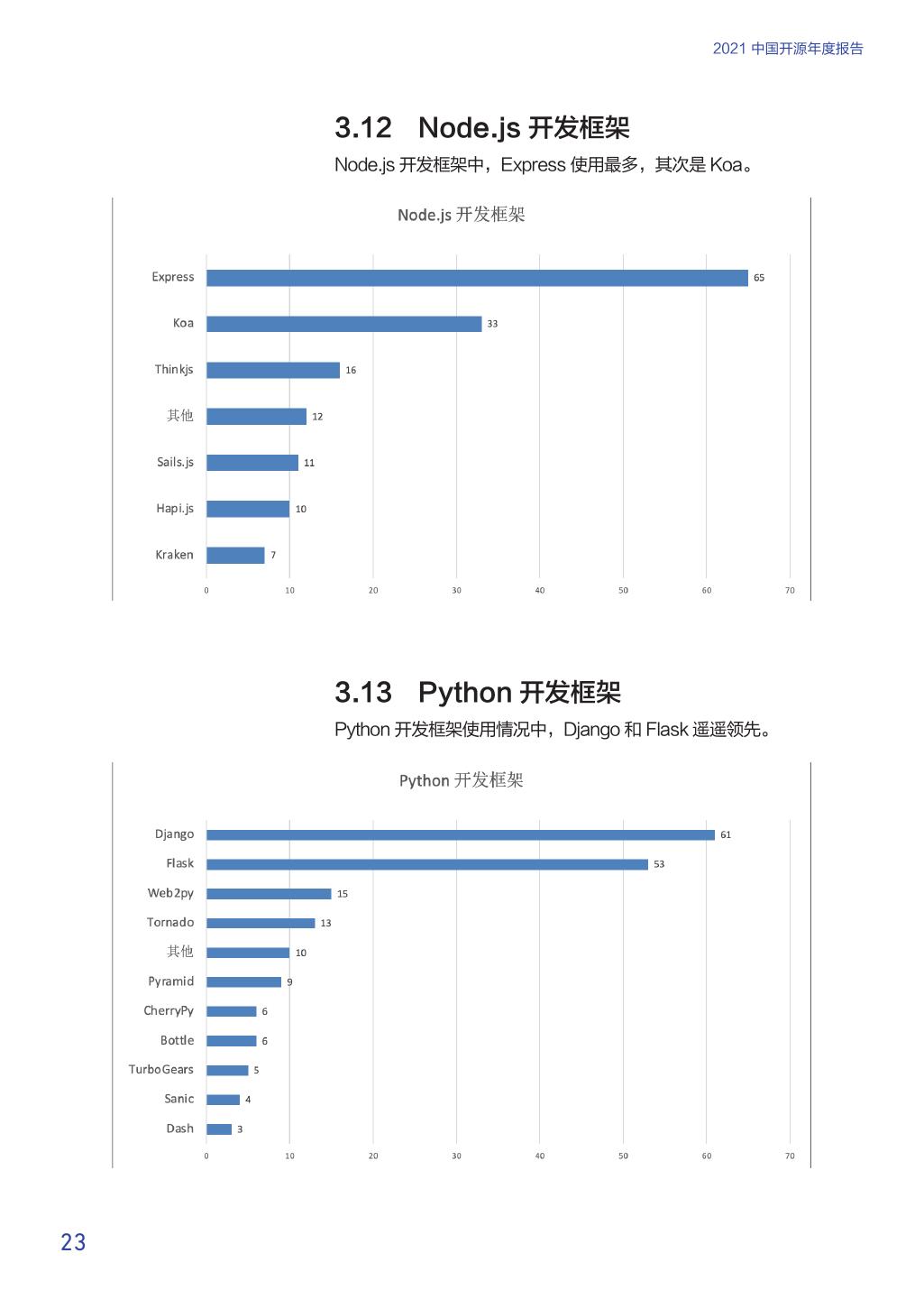 23 . 2021 中国开源年度报告 3.12 Node.js 开发框架 Node.js 开发框架中,Express 使用最多,其次是 Koa。 3.13 Python 开发框架 Python 开发框架使用情况中,Django 和 Flask 遥遥领先。 23