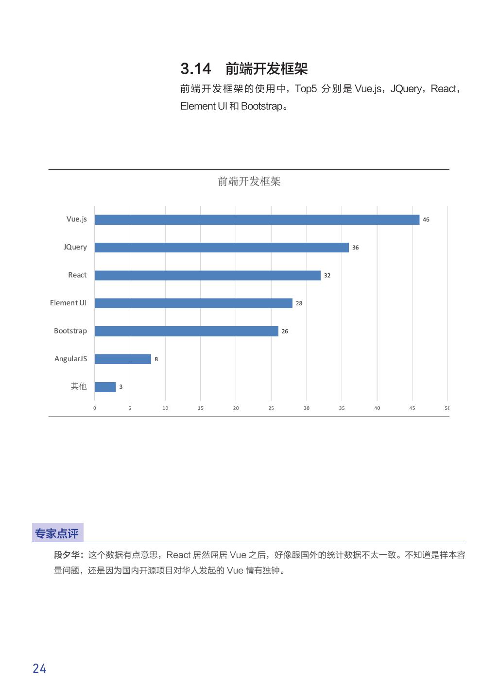 24 . 3.14 前端开发框架 前 端 开 发 框 架 的 使 用 中,Top5 分 别 是 Vue.js,JQuery,React, Element UI 和 Bootstrap。 专家点评 段夕华:这个数据有点意思,React 居然屈居 Vue 之后,好像跟国外的统计数据不太一致。不知道是样本容 量问题,还是因为国内开源项目对华人发起的 Vue 情有独钟。 24