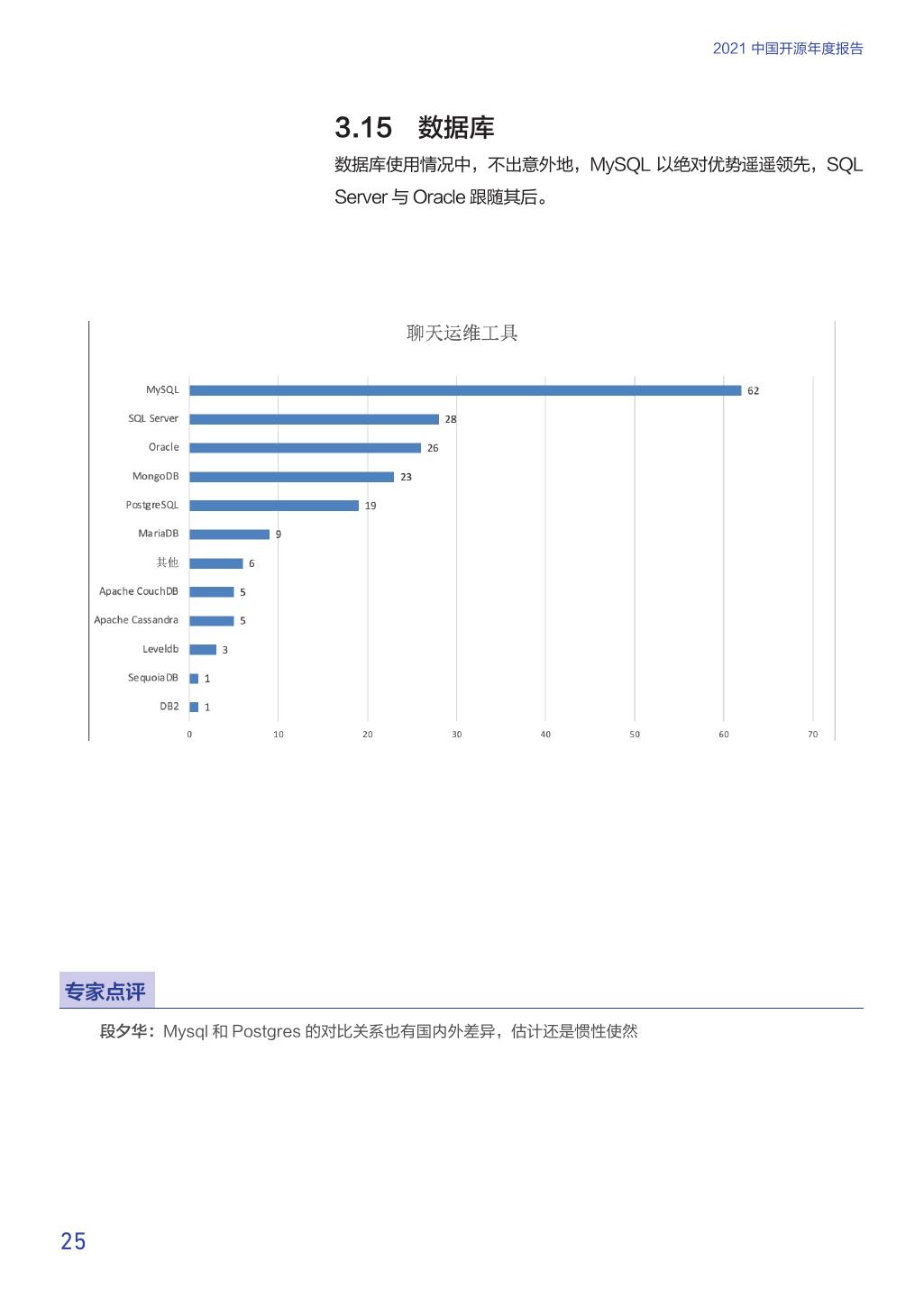 25 . 2021 中国开源年度报告 3.15 数据库 数据库使用情况中,不出意外地,MySQL 以绝对优势遥遥领先,SQL Server 与 Oracle 跟随其后。 专家点评 段夕华:Mysql 和 Postgres 的对比关系也有国内外差异,估计还是惯性使然 25