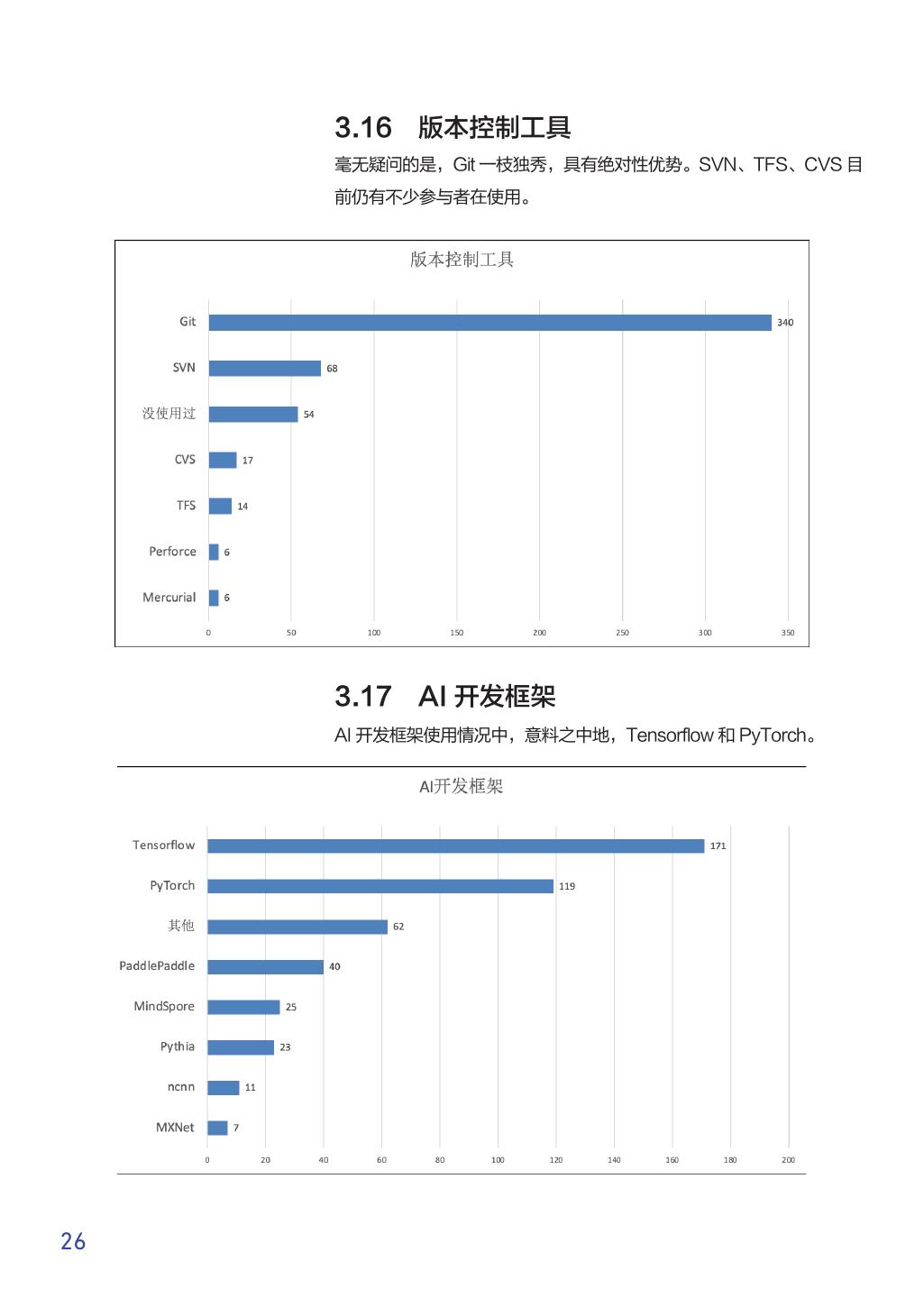 26 . 3.16 版本控制工具 毫无疑问的是,Git 一枝独秀,具有绝对性优势。SVN、TFS、CVS 目 前仍有不少参与者在使用。 3.17 AI 开发框架 AI 开发框架使用情况中,意料之中地,Tensorflow 和 PyTorch。 26