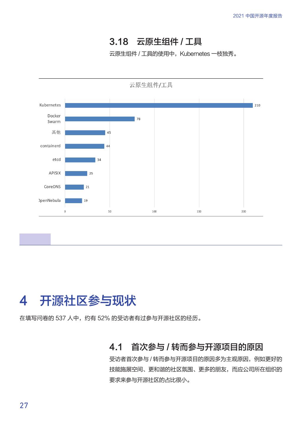 27 . 2021 中国开源年度报告 3.18 云原生组件 / 工具 云原生组件 / 工具的使用中,Kubernetes 一枝独秀。 4 开源社区参与现状 在填写问卷的 537 人中,约有 52% 的受访者有过参与开源社区的经历。 4.1 首次参与 / 转而参与开源项目的原因 受访者首次参与 / 转而参与开源项目的原因多为主观原因,例如更好的 技能施展空间、更和谐的社区氛围、更多的朋友,而应公司所在组织的 要求来参与开源社区的占比很小。 27