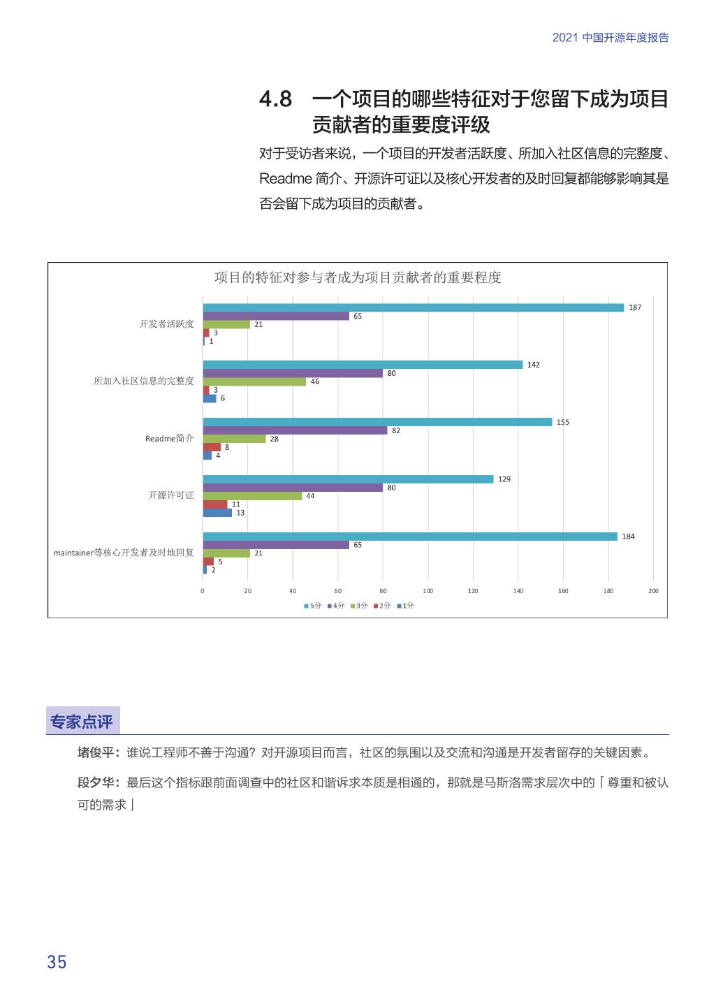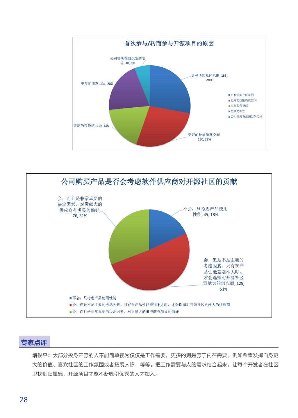 28 .专家点评 堵俊平:大部分投身开源的人不能简单视为仅仅是工作需要,更多的则是源于内在需要。例如希望发挥自身更 大的价值、喜欢社区的工作氛围或者拓展人脉,等等。把工作需要与人的需求结合起来,让每个开发者在社区 里找到归属感,开源项目才能不断吸引优秀的人才加入。 28