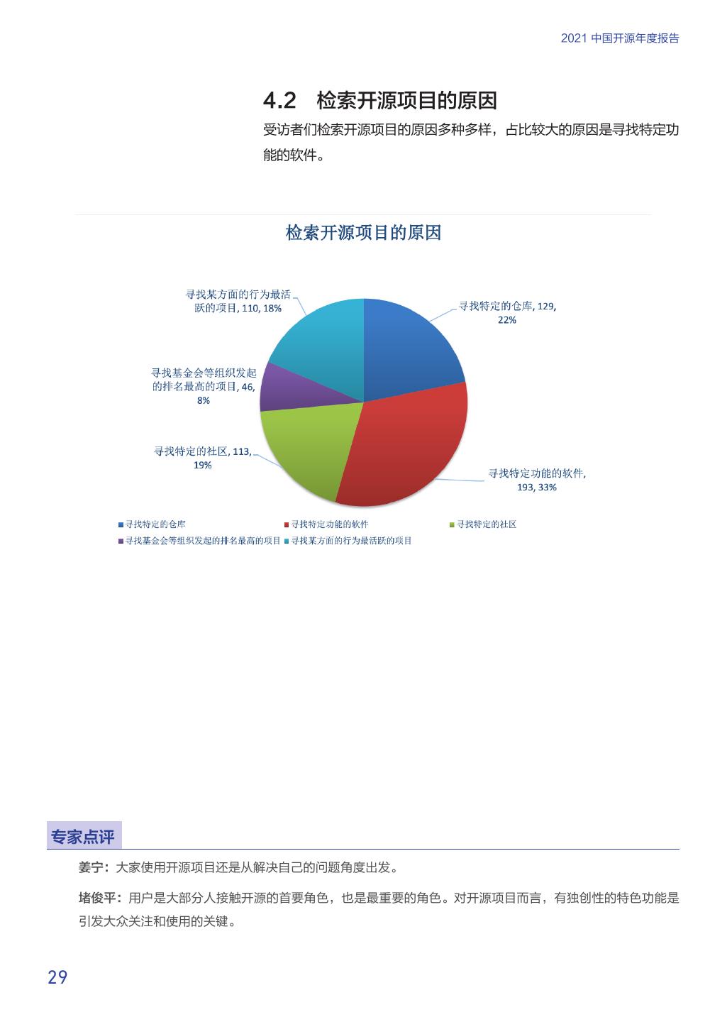 29 . 2021 中国开源年度报告 4.2 检索开源项目的原因 受访者们检索开源项目的原因多种多样,占比较大的原因是寻找特定功 能的软件。 专家点评 姜宁:大家使用开源项目还是从解决自己的问题角度出发。 堵俊平:用户是大部分人接触开源的首要角色,也是最重要的角色。对开源项目而言,有独创性的特色功能是 引发大众关注和使用的关键。 29