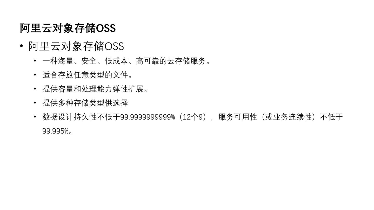 3 .阿里云对象存储OSS • 阿里云对象存储OSS • 一种海量、安全、低成本、高可靠的云存储服务。 • 适合存放任意类型的文件。 • 提供容量和处理能力弹性扩展。 • 提供多种存储类型供选择 • 数据设计持久性不低于99.9999999999%(12个9),服务可用性(或业务连续性)不低于 99.995%。