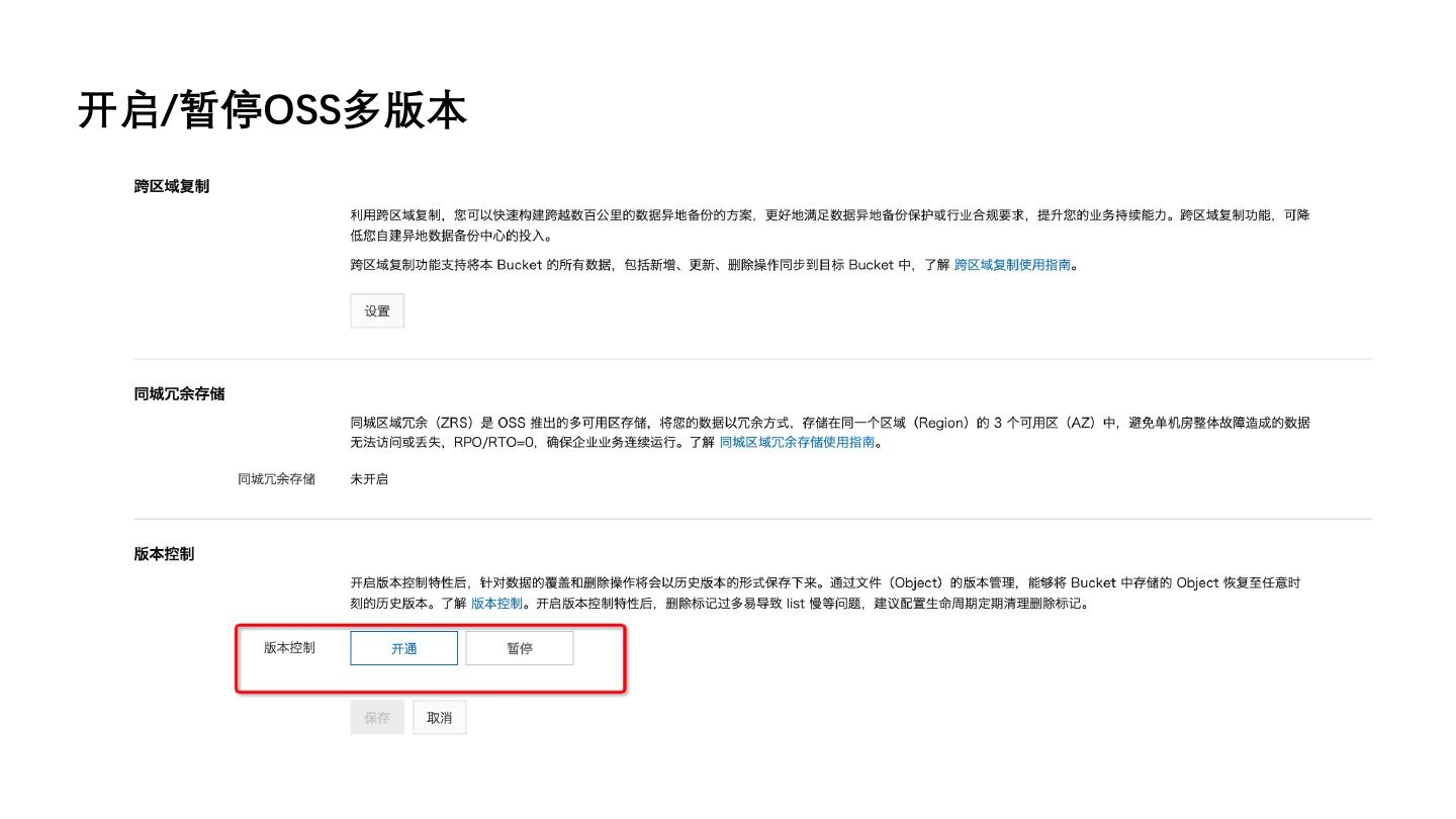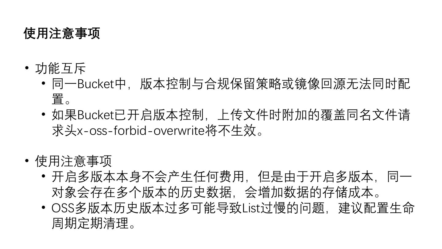 8 .使用注意事项 • 功能互斥 • 同一Bucket中,版本控制与合规保留策略或镜像回源无法同时配 置。 • 如果Bucket已开启版本控制,上传文件时附加的覆盖同名文件请 求头x-oss-forbid-overwrite将不生效。 • 使用注意事项 • 开启多版本本身不会产生任何费用,但是由于开启多版本,同一 对象会存在多个版本的历史数据,会增加数据的存储成本。 • OSS多版本历史版本过多可能导致List过慢的问题,建议配置生命 周期定期清理。