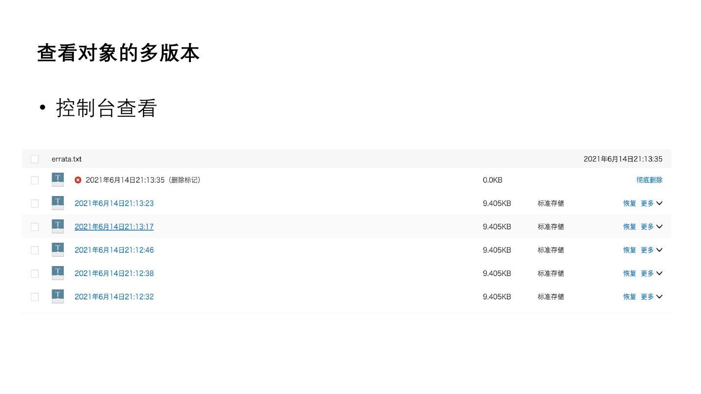 5 .OSS对象数据多版本管理 • 功能介绍 • 单份数据在OSS上存在多个版本。 • 使用场景 • 数据误删除:当前OSS不提供回收站,如果要恢复已删除的数据 可以使用OSS多版本。 • 文件被覆盖:对于网盘、在线协作类产品,文件会被频繁修改, 针对文件的编辑会产生大量的临时版本。您可以使用版本控制功 能找回某个时间点的版本。