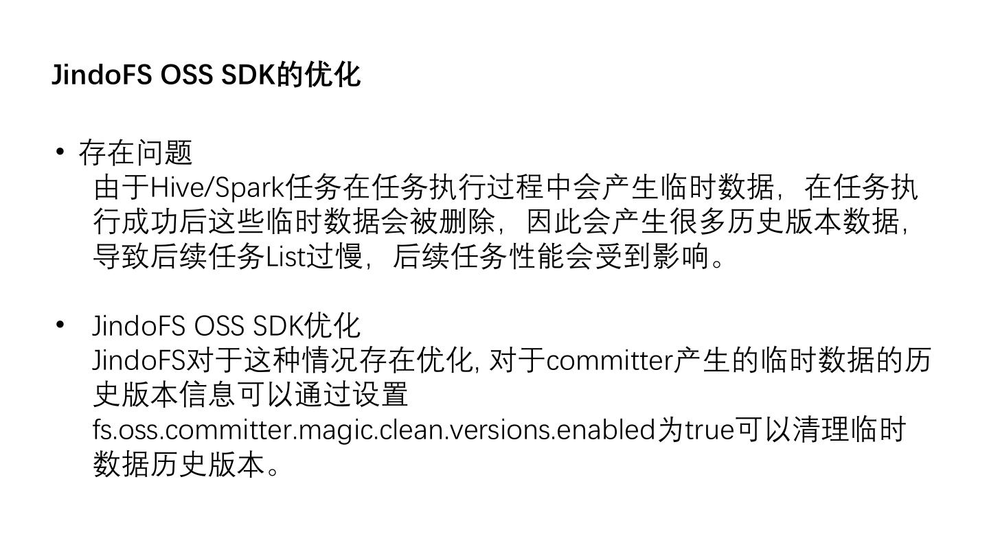 11 .JindoFS OSS SDK的优化 • 存在问题 由于Hive/Spark任务在任务执行过程中会产生临时数据,在任务执 行成功后这些临时数据会被删除,因此会产生很多历史版本数据, 导致后续任务List过慢,后续任务性能会受到影响。 • JindoFS OSS SDK优化 JindoFS对于这种情况存在优化, 对于committer产生的临时数据的历 史版本信息可以通过设置 fs.oss.committer.magic.clean.versions.enabled为true可以清理临时 数据历史版本。