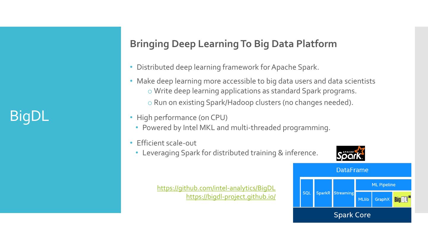 4 . Bringing Deep Learning To Big Data Platform • Distributed deep learning framework for Apache Spark. • Make deep learning more accessible to big data users and data scientists o Write deep learning applications as standard Spark programs. o Run on existing Spark/Hadoop clusters (no changes needed). BigDL • High performance (on CPU) • Powered by Intel MKL and multi-threaded programming. • Efficient scale-out • Leveraging Spark for distributed training & inference. https://github.com/intel-analytics/BigDL https://bigdl-project.github.io/