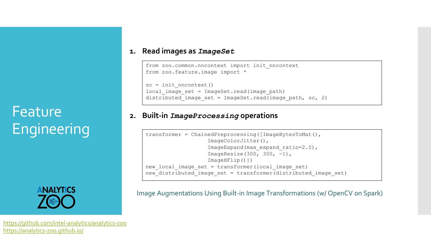 6 . 1. Read images as ImageSet from zoo.common.nncontext import init_nncontext from zoo.feature.image import * sc = init_nncontext() local_image_set = ImageSet.read(image_path) distributed_image_set = ImageSet.read(image_path, sc, 2) Feature 2. Built-in ImageProcessing operations Engineering transformer = ChainedPreprocessing([ImageBytesToMat(), ImageColorJitter(), ImageExpand(max_expand_ratio=2.0), ImageResize(300, 300, -1), ImageHFlip()]) new_local_image_set = transformer(local_image_set) new_distributed_image_set = transformer(distributed_image_set) Image Augmentations Using Built-in Image Transformations (w/ OpenCV on Spark) https://github.com/intel-analytics/analytics-zoo https://analytics-zoo.github.io/