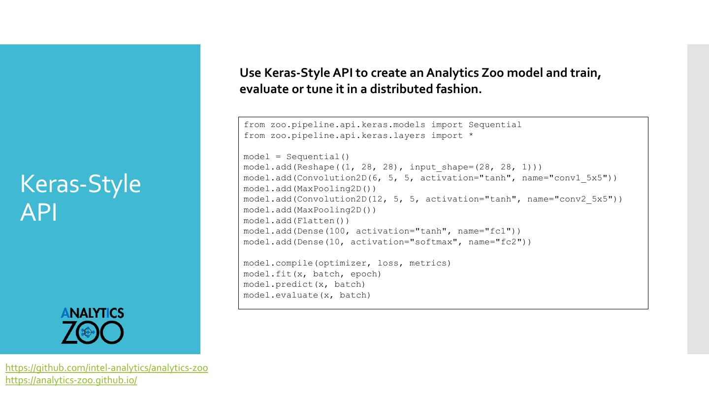 7 . Use Keras-Style API to create an Analytics Zoo model and train, evaluate or tune it in a distributed fashion. from zoo.pipeline.api.keras.models import Sequential from zoo.pipeline.api.keras.layers import * model = Sequential() model.add(Reshape((1, 28, 28), input_shape=(28, 28, 1))) Keras-Style model.add(Convolution2D(6, 5, 5, activation="tanh", name="conv1_5x5")) model.add(MaxPooling2D()) model.add(Convolution2D(12, 5, 5, activation="tanh", name="conv2_5x5")) API model.add(MaxPooling2D()) model.add(Flatten()) model.add(Dense(100, activation="tanh", name="fc1")) model.add(Dense(10, activation="softmax", name="fc2")) model.compile(optimizer, loss, metrics) model.fit(x, batch, epoch) model.predict(x, batch) model.evaluate(x, batch) https://github.com/intel-analytics/analytics-zoo https://analytics-zoo.github.io/