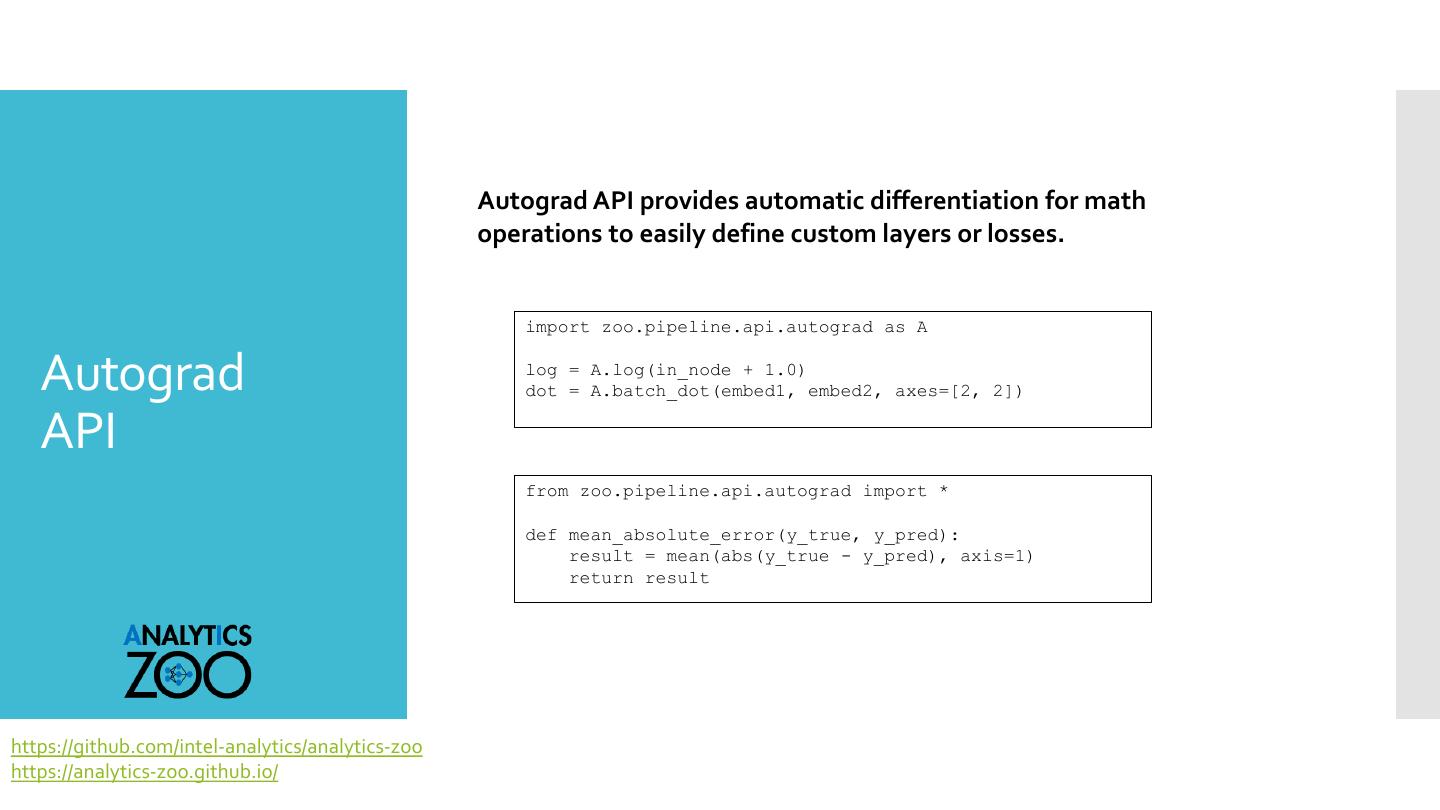 8 . Autograd API provides automatic differentiation for math operations to easily define custom layers or losses. import zoo.pipeline.api.autograd as A Autograd log = A.log(in_node + 1.0) dot = A.batch_dot(embed1, embed2, axes=[2, 2]) API from zoo.pipeline.api.autograd import * def mean_absolute_error(y_true, y_pred): result = mean(abs(y_true - y_pred), axis=1) return result https://github.com/intel-analytics/analytics-zoo https://analytics-zoo.github.io/