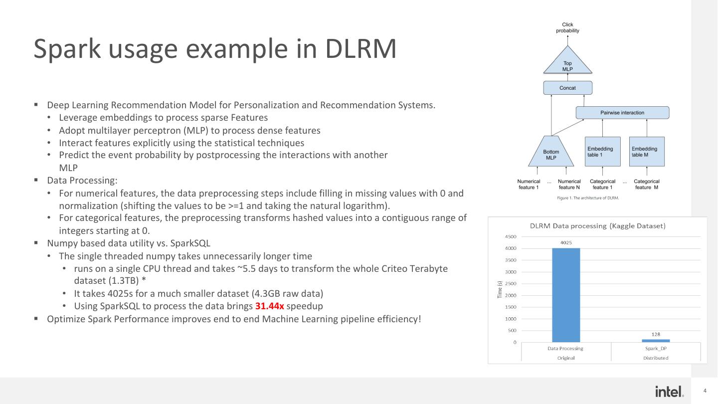 4 .Spark usage example in DLRM § Deep Learning Recommendation Model for Personalization and Recommendation Systems. • Leverage embeddings to process sparse Features • Adopt multilayer perceptron (MLP) to process dense features • Interact features explicitly using the statistical techniques • Predict the event probability by postprocessing the interactions with another MLP § Data Processing: • For numerical features, the data preprocessing steps include filling in missing values with 0 and normalization (shifting the values to be >=1 and taking the natural logarithm). • For categorical features, the preprocessing transforms hashed values into a contiguous range of integers starting at 0. § Numpy based data utility vs. SparkSQL • The single threaded numpy takes unnecessarily longer time • runs on a single CPU thread and takes ~5.5 days to transform the whole Criteo Terabyte dataset (1.3TB) * • It takes 4025s for a much smaller dataset (4.3GB raw data) • Using SparkSQL to process the data brings 31.44x speedup § Optimize Spark Performance improves end to end Machine Learning pipeline efficiency! 4