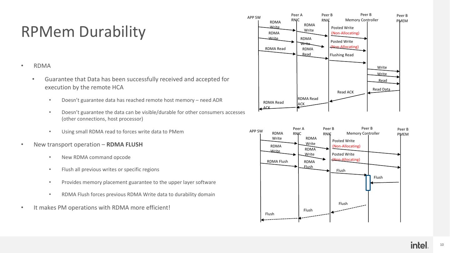 10 . Peer A Peer B Peer B Peer B APP SW RNIC RNIC Memory Controller PMEM RDMA RPMem Durability RDMA Write Posted Write Write RDMA (Non-Allocating) Write RDMA Posted Write Write (Non-Allocating) RDMA Read RDMA Read Flushing Read • RDMA Write Write • Guarantee that Data has been successfully received and accepted for Read execution by the remote HCA Read Data Read ACK • Doesn’t guarantee data has reached remote host memory – need ADR RDMA Read RDMA Read ACK ACK • Doesn’t guarantee the data can be visible/durable for other consumers accesses (other connections, host processor) Peer A Peer B Peer B Peer B • Using small RDMA read to forces write data to PMem APP SW RDMA RNIC RNIC Memory Controller PMEM Write RDMA Posted Write • New transport operation – RDMA FLUSH RDMA Write (Non-Allocating) RDMA Write Write Posted Write • New RDMA command opcode (Non-Allocating) RDMA Flush RDMA Flush • Flush all previous writes or specific regions Flush Flush • Provides memory placement guarantee to the upper layer software • RDMA Flush forces previous RDMA Write data to durability domain Flush • It makes PM operations with RDMA more efficient! Flush Flush 10