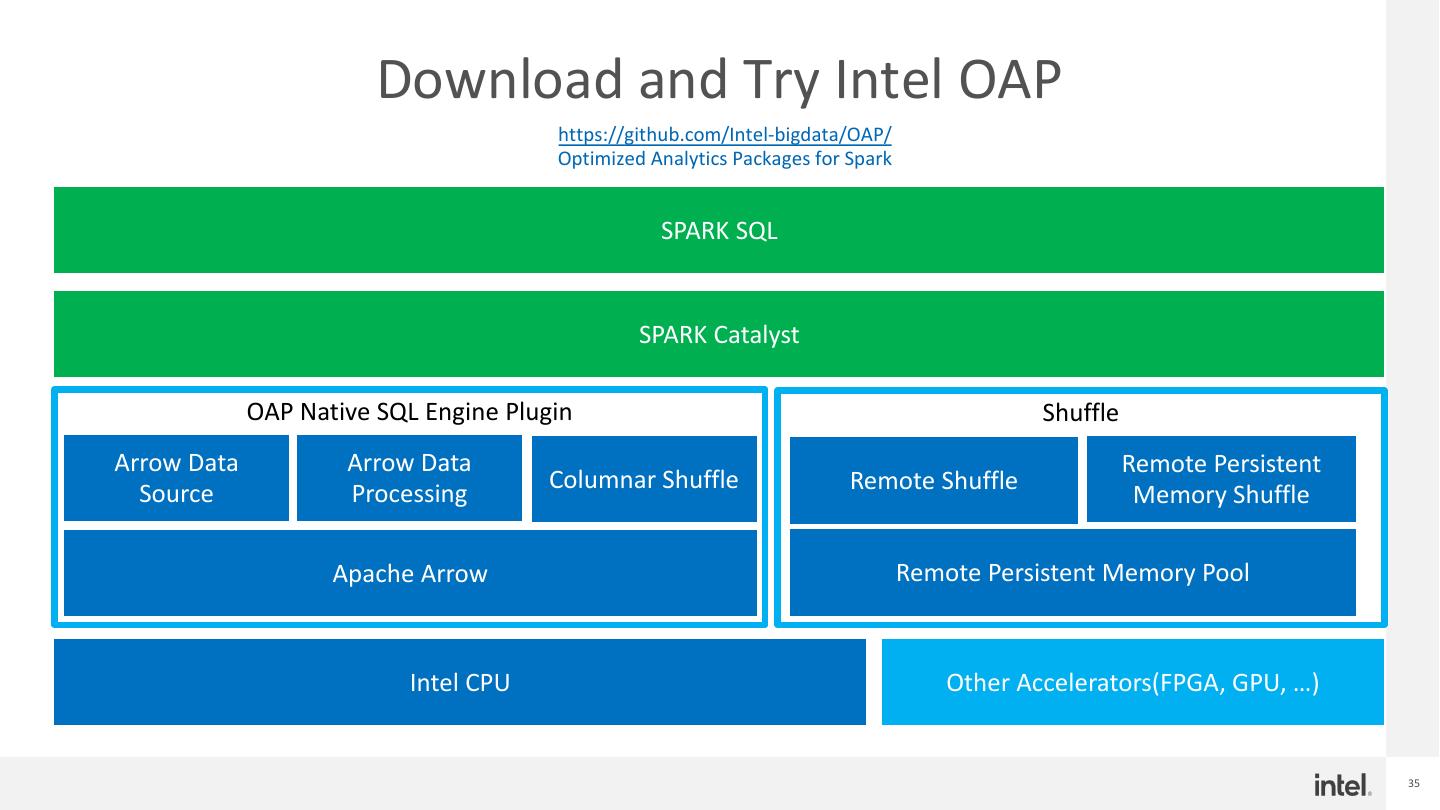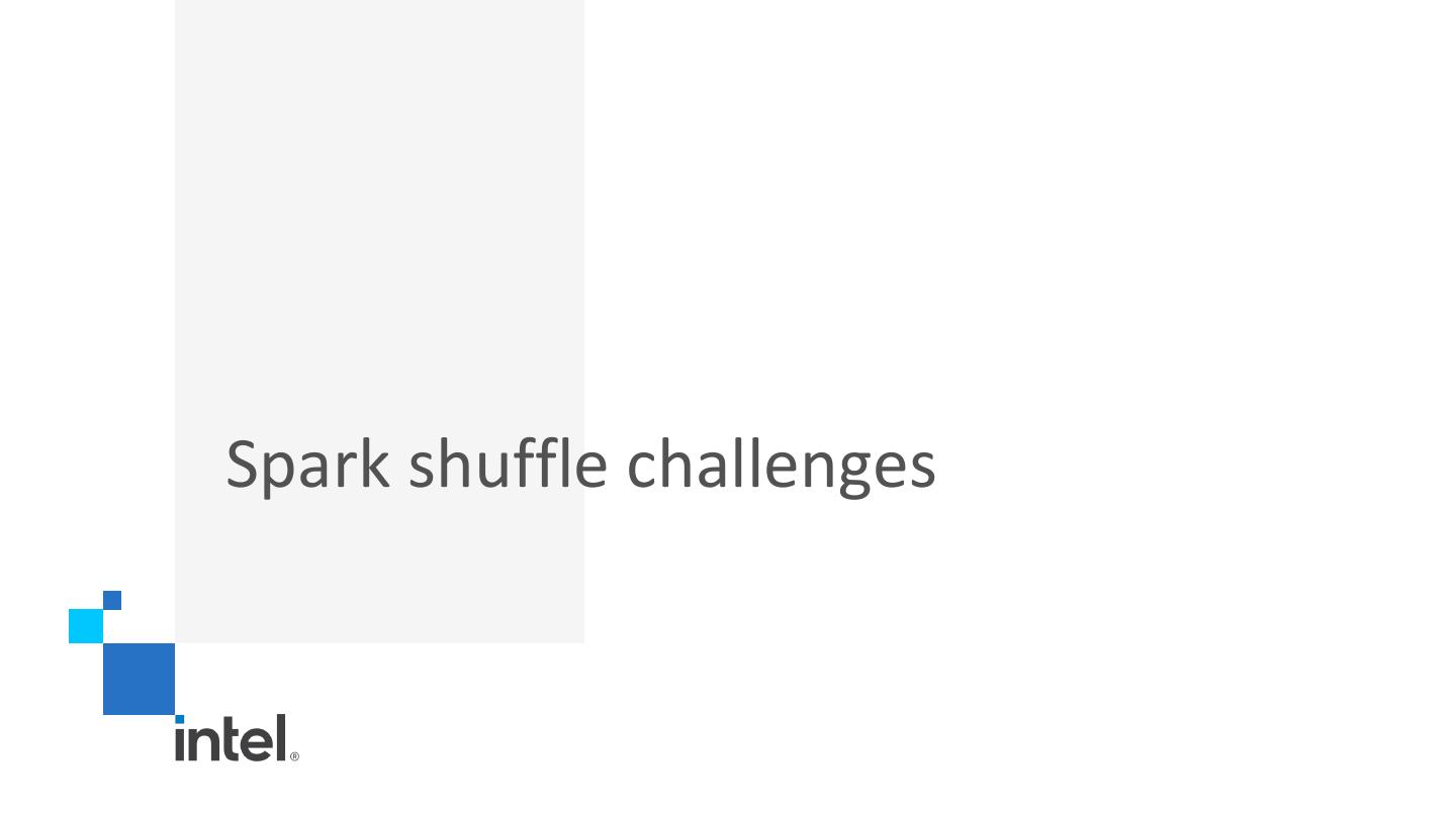 13 .Challenges of Spark shuffle § Data Center Infrastructure evolution • Compute and storage disaggregation become a key trend, diskless environment becoming more and more popular • Modern datacenter is evolving: high speed network between compute and disaggregated storage and tiered storage architecture makes local storage less attractive • New storage technologies are emerging, e.g., storage class memory (or PMem) § Spark shuffle Challenges • Uneven resource utilization of CPU and Memory • Out of memory issues and GC • Disk I/O too slow • Data spill degrades performance • Shuffle I/O grows quadratically with data • Local SSDs wear out by frequent intermediate data writes • Unaffordable re-compute cost § Other related works • Intel Disaggregated shuffle w/ DAOS1, Facebook cosco2, Baidu DCE shuffle3, JD.com & Memverge RSS 4 and etc. 1. https://www.slideshare.net/databricks/improving-apache-spark-by-taking-advantage-of-disaggregated-architecture 2. https://databricks.com/session/cosco-an-efficient-facebook-scale-shuffle-service 3. http://apache-spark-developers-list.1001551.n3.nabble.com/Enabling-fully-disaggregated-shuffle-on-Spark-td28329.html 4. https://databricks.com/session/optimizing-performance-and-computing-resource-efficiency-of-in-memory-big-data-analytics-with-disaggregated-persistent-memory 13