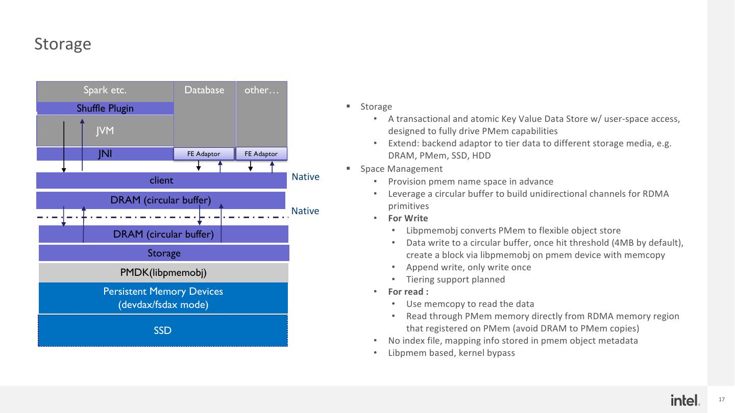 17 .Storage Spark etc. Database other… Shuffle Plugin § Storage • A transactional and atomic Key Value Data Store w/ user-space access, JVM designed to fully drive PMem capabilities • Extend: backend adaptor to tier data to different storage media, e.g. JNI FE Adaptor FE Adaptor DRAM, PMem, SSD, HDD § Space Management client Native • Provision pmem name space in advance • Leverage a circular buffer to build unidirectional channels for RDMA DRAM (circular buffer) primitives Native • For Write DRAM (circular buffer) • Libpmemobj converts PMem to flexible object store • Data write to a circular buffer, once hit threshold (4MB by default), Storage create a block via libpmemobj on pmem device with memcopy • Append write, only write once PMDK(libpmemobj) • Tiering support planned Persistent Memory Devices • For read : (devdax/fsdax mode) • Use memcopy to read the data • Read through PMem memory directly from RDMA memory region SSD that registered on PMem (avoid DRAM to PMem copies) • No index file, mapping info stored in pmem object metadata • Libpmem based, kernel bypass 17