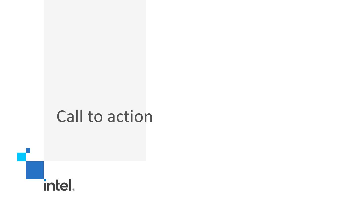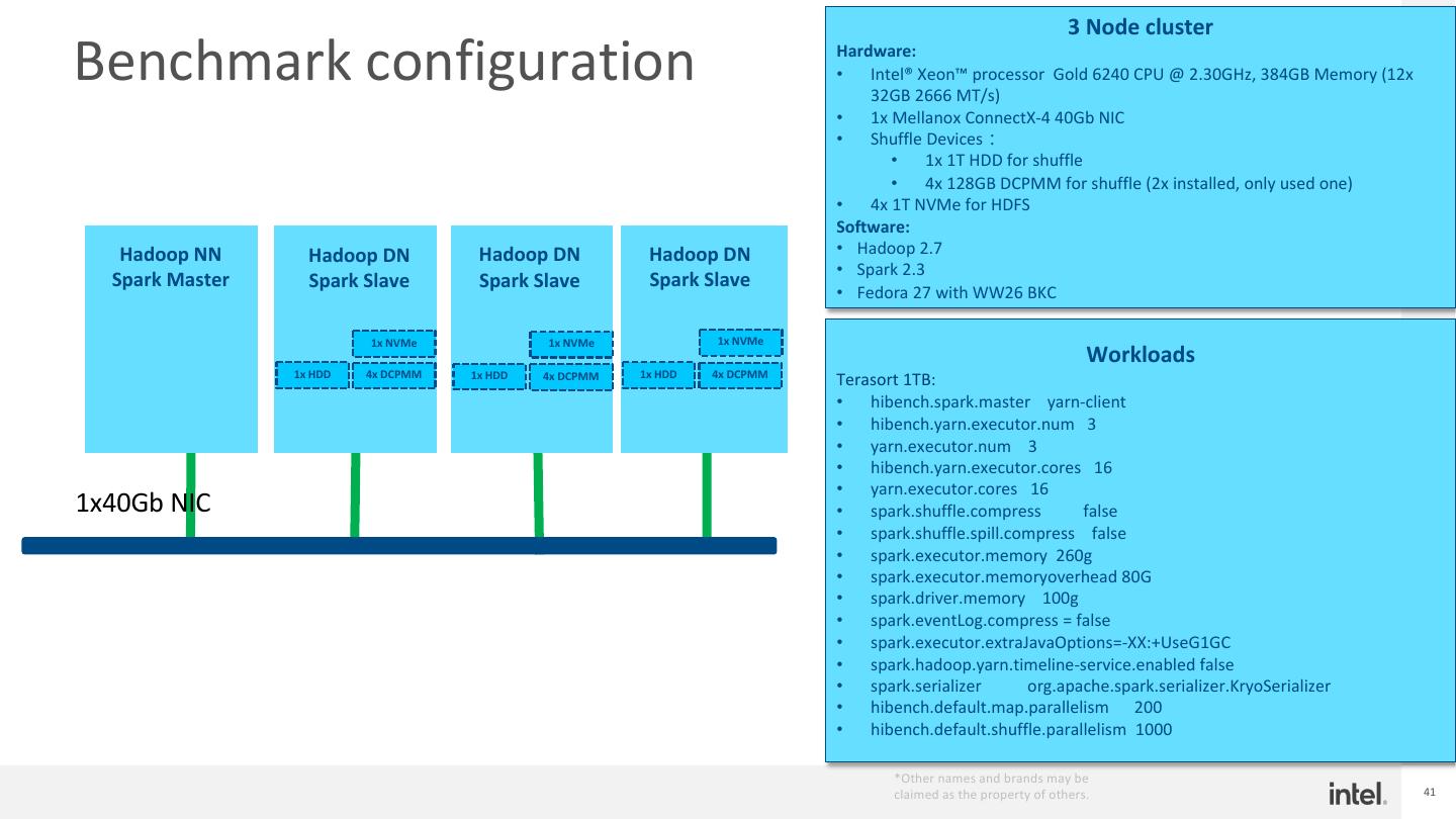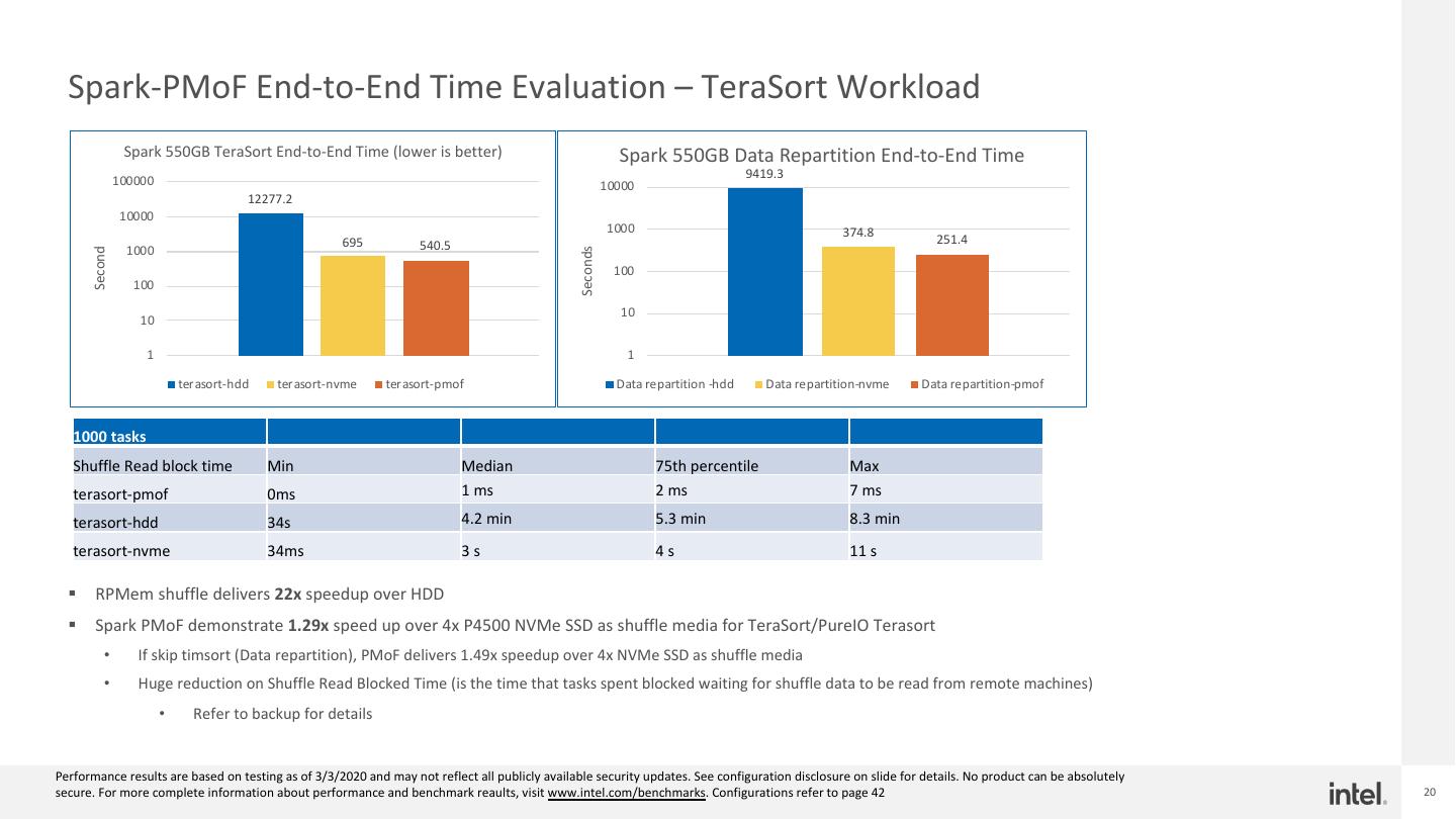 20 . Spark-PMoF End-to-End Time Evaluation – TeraSort Workload Spark 550GB TeraSort End-to-End Time (lower is better) Spark 550GB Data Repartition End-to-End Time 9419.3 100000 10000 12277.2 10000 1000 374.8 695 540.5 251.4 1000 Seconds Second 100 100 10 10 1 1 terasort-hdd terasort-nvme terasort-pmof Data repartition -hdd Data repartition-nvme Data repartition-pmof 1000 tasks Shuffle Read block time Min Median 75th percentile Max terasort-pmof 0ms 1 ms 2 ms 7 ms terasort-hdd 34s 4.2 min 5.3 min 8.3 min terasort-nvme 34ms 3s 4s 11 s § RPMem shuffle delivers 22x speedup over HDD § Spark PMoF demonstrate 1.29x speed up over 4x P4500 NVMe SSD as shuffle media for TeraSort/PureIO Terasort • If skip timsort (Data repartition), PMoF delivers 1.49x speedup over 4x NVMe SSD as shuffle media • Huge reduction on Shuffle Read Blocked Time (is the time that tasks spent blocked waiting for shuffle data to be read from remote machines) • Refer to backup for details Performance results are based on testing as of 3/3/2020 and may not reflect all publicly available security updates. See configuration disclosure on slide for details. No product can be absolutely secure. For more complete information about performance and benchmark reaults, visit www.intel.com/benchmarks. Configurations refer to page 42 20