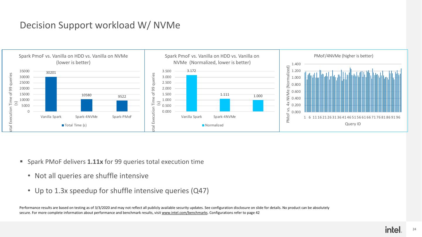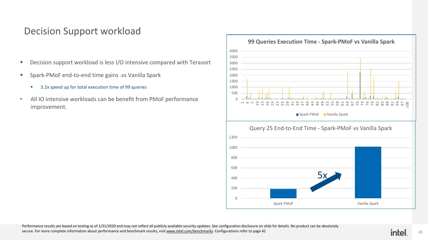 24 . Decision Support workload W/ NVMe Spark PmoF vs. Vanilla on HDD vs. Vanilla on NVMe Spark PmoF vs. Vanilla on HDD vs. Vanilla on PMoF/4NVMe (higher is better) (lower is better) NVMe (Normalized, lower is better) 1.400 PMoF vs. 4x NVMe (Normalized) 35000 30201 3.500 3.172 1.200 Total Execution Time of 99 queries Total Execution Time of 99 queries 30000 3.000 1.000 25000 2.500 0.800 20000 2.000 0.600 15000 10580 1.500 1.111 1.000 9522 0.400 10000 1.000 (s) (s) 5000 0.500 0.200 0 0.000 0.000 Vanilla Spark Spark-4NVMe Spark-PMoF Vanilla Spark Spark-4NVMe 1 6 11 16 21 26 31 36 41 46 51 56 61 66 71 76 81 86 91 96 Total Time (s) Normalized Query ID § Spark PMoF delivers 1.11x for 99 queries total execution time • Not all queries are shuffle intensive • Up to 1.3x speedup for shuffle intensive queries (Q47) Performance results are based on testing as of 3/3/2020 and may not reflect all publicly available security updates. See configuration disclosure on slide for details. No product can be absolutely secure. For more complete information about performance and benchmark results, visit www.intel.com/benchmarks. Configurations refer to page 42 24