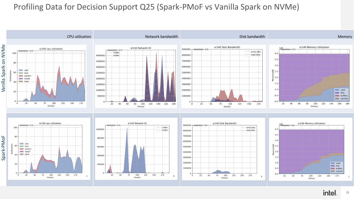 25 . Profiling Data for Decision Support Q25 (Spark-PMoF vs Vanilla Spark on NVMe) CPU utilization Network bandwidth Disk bandwidth Memory Vanilla Spark on NVMe Spark-PMoF 25