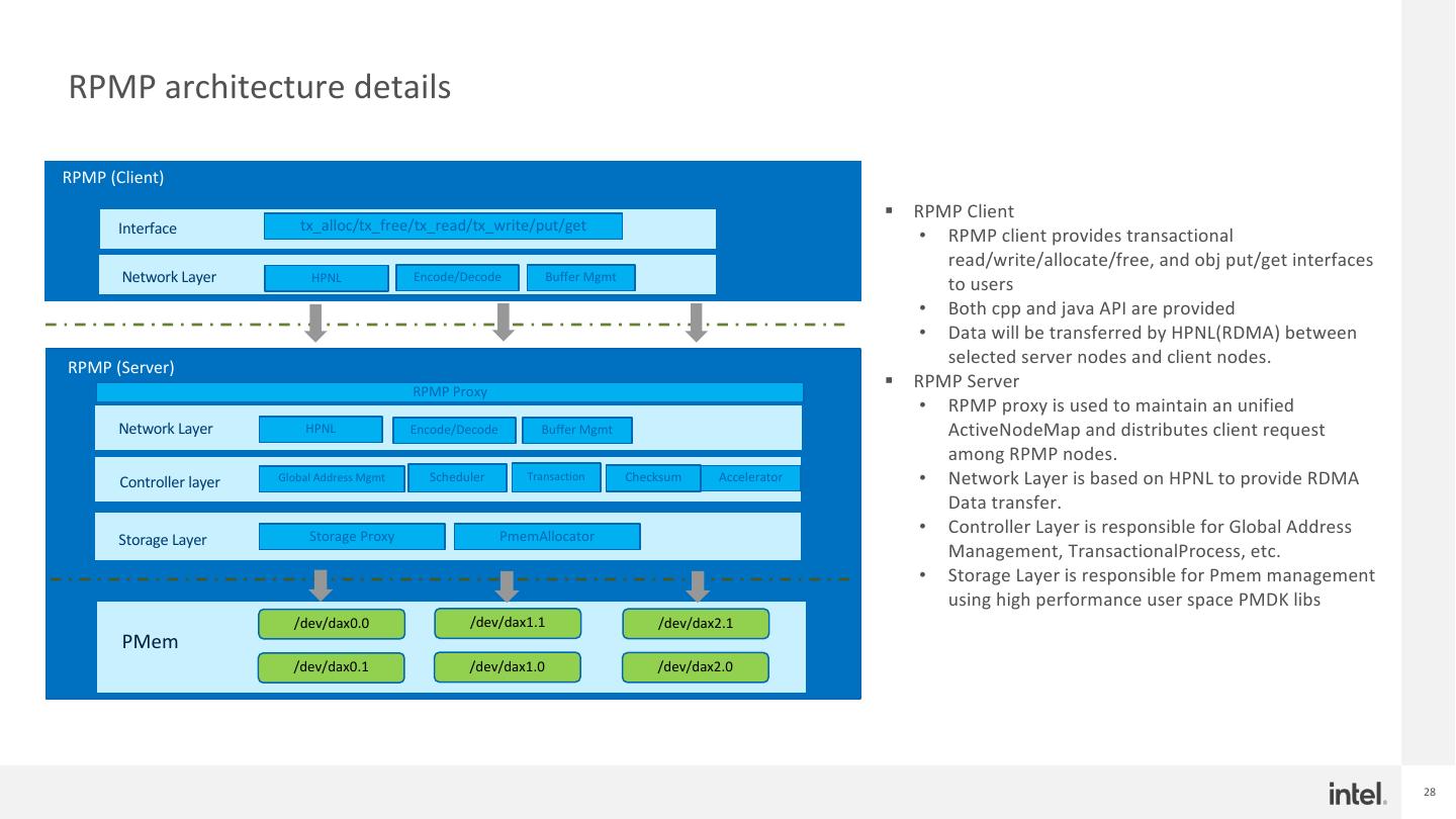 27 .RPMP Architecture § Remote Persistent Memory Pool: SQL K/V Transactions Streaming Machine Learning § A persistent memory based distributed storage system § An RDMA powered network library and an innovative approach to use persistent Compute memory as both shuffle media as well as RDMA memory region to reduce additional Spark Flink Presto memory copies and context switches. shuffle data cache § Target as high-performance storage & ephemeral data storage Storage Ephemeral Data § Features RPMP Data Lake § High Performance Storage powered by modern HW like PMem and RDMA w/ user- DRAM PMem SSD Object Block File level I/O access § Rich API: Provides memory-like allocate/free/read/write APIs on pooled PMem resources § Pluggable modules: A modular architecture makes it can be plugged into in memory database, Apache Spark (shuffle) & Cache etc. § Heterogeneous tiered storage backend § Benefits § Improved scalability of analytics and AI workloads by disaggregating ephemeral data from compute node to a high-performance distributed storage, e.g., Spark shuffle § Improved performance with high speed persistent memory and low latency RDMA network § Improved reliability by providing a manageable and highly available disaggregated storage supports ephemeral data replication and fault-tolerant, e.g. shuffle data to avoid recompute. 27