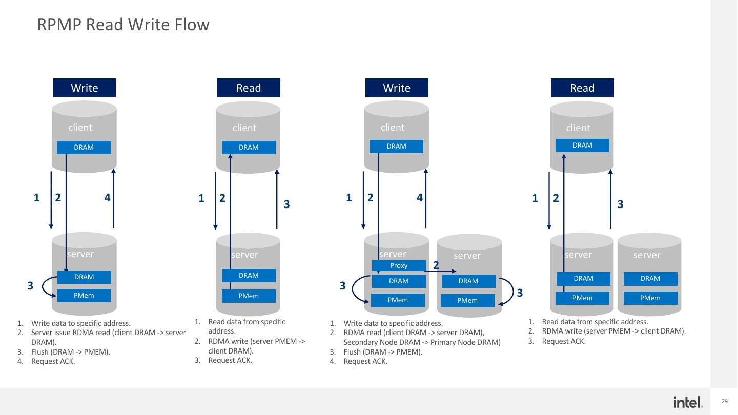 29 . RPMP Read Write Flow Write Read Write Read client client client client DRAM DRAM DRAM DRAM 1 2 4 1 2 1 2 4 1 2 3 3 server server server server server server Proxy 2 DRAM DRAM DRAM DRAM DRAM DRAM 3 3 PMem PMem PMem PMem 3 PMem PMem 1. Write data to specific address. 1. Read data from specific 1. Write data to specific address. 1. Read data from specific address. 2. Server issue RDMA read (client DRAM -> server address. 2. RDMA read (client DRAM -> server DRAM), 2. RDMA write (server PMEM -> client DRAM). DRAM). 2. RDMA write (server PMEM -> Secondary Node DRAM -> Primary Node DRAM) 3. Request ACK. 3. Flush (DRAM -> PMEM). client DRAM). 3. Flush (DRAM -> PMEM). 4. Request ACK. 3. Request ACK. 4. Request ACK. 29