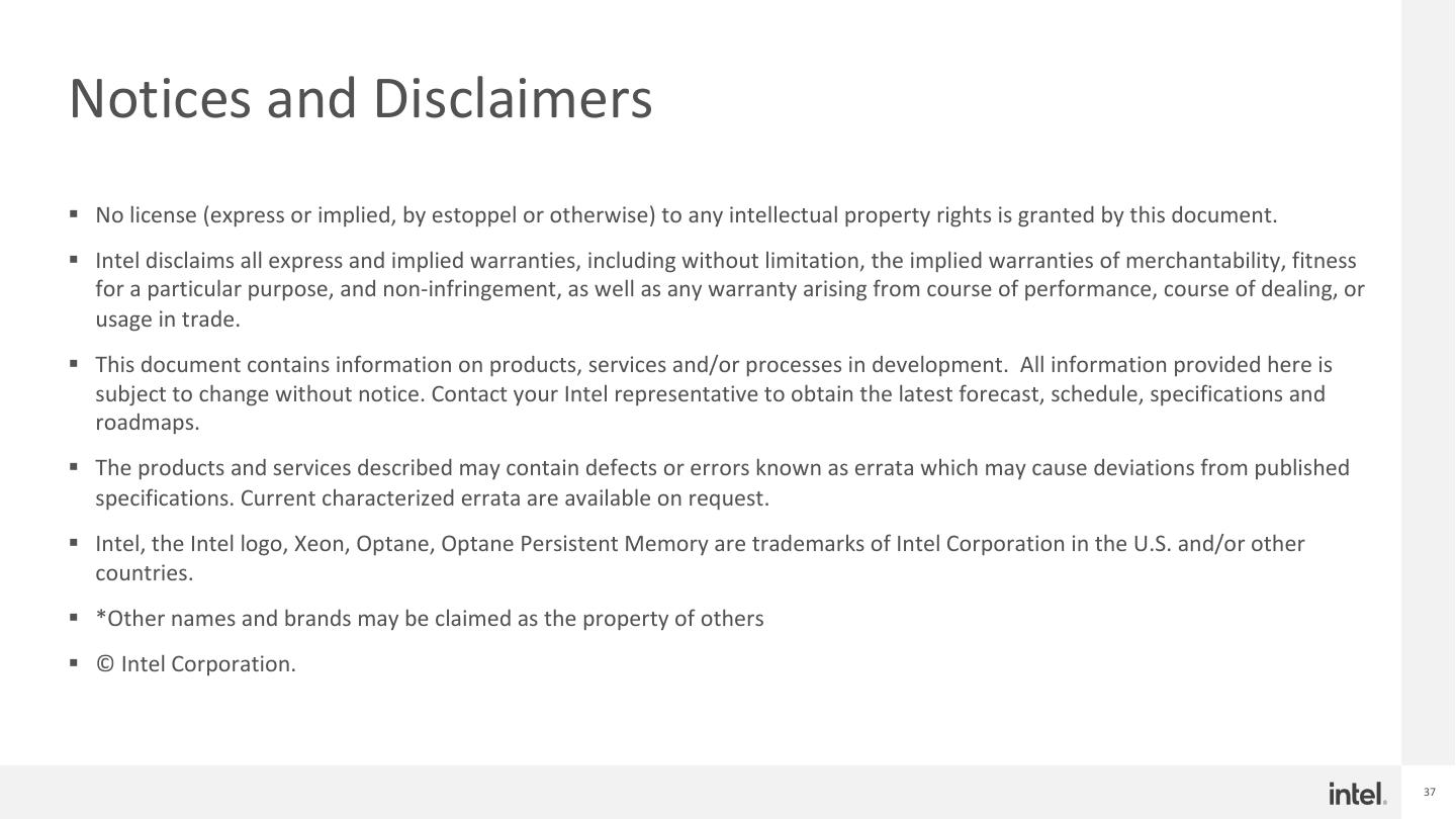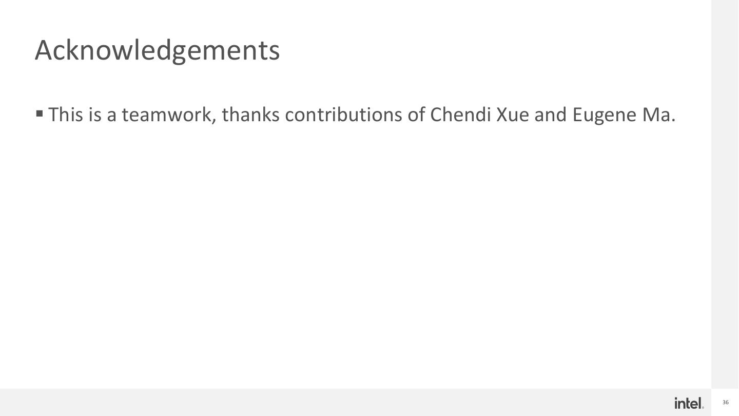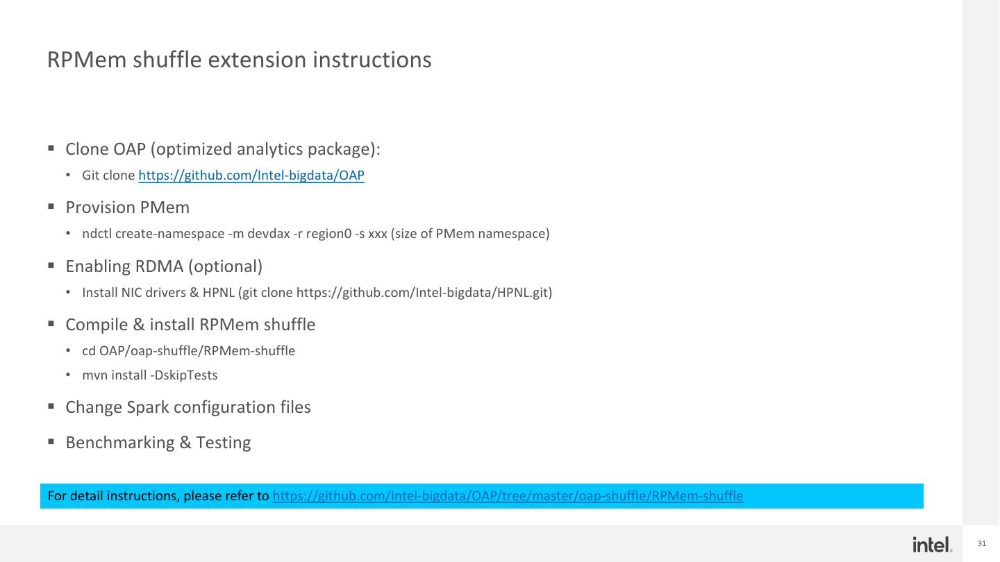 26 .Extending to fully Disaggregated Shuffle solution § Remote Persistent Memory for read demonstrated good results, but what’s more? § In real production environment, there are more challenges • Disaggregated, diskless environment • Scale shuffle/compute independently • CPU/Memory unbalanced issue • Some jobs lasts for long time, stage recompute cost is intolerable in case of shuffle failure § Elastic Deployment with compute and storage disaggregation requires independent shuffle solution • Decouple shuffle I/O from a specific network/storage is capable of delivering dedicated SLA for critical applications • Fault tolerant in case on shuffle failure, no need for recompute • Offload spill as well, reduced compute memory resource requirements • Balanced resource utilization • Leverage state-of-art storage medium as storage media • To provide high performance, high endurance storage backend § Drive the intention to build a RPMem based, fully disaggregated shuffle solution! 26