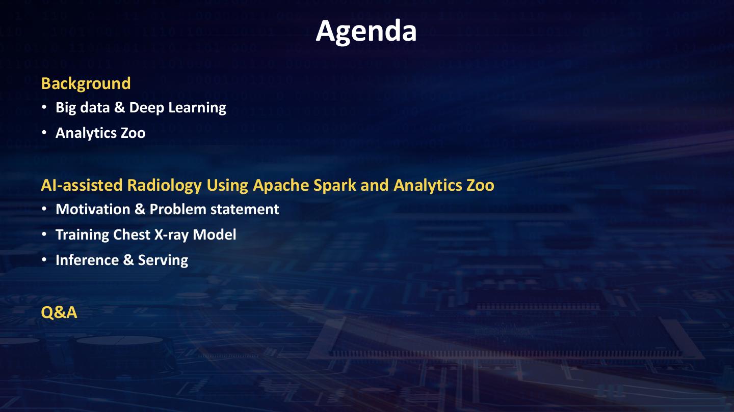 本次分享主要介绍如何利用Analytics Zoo和NIH胸部X光影像数据集,在Apache Spark集群上实现基于深度学习的胸腔疾病分类,为医生提供端到端的胸腔疾病AI诊疗辅助。
