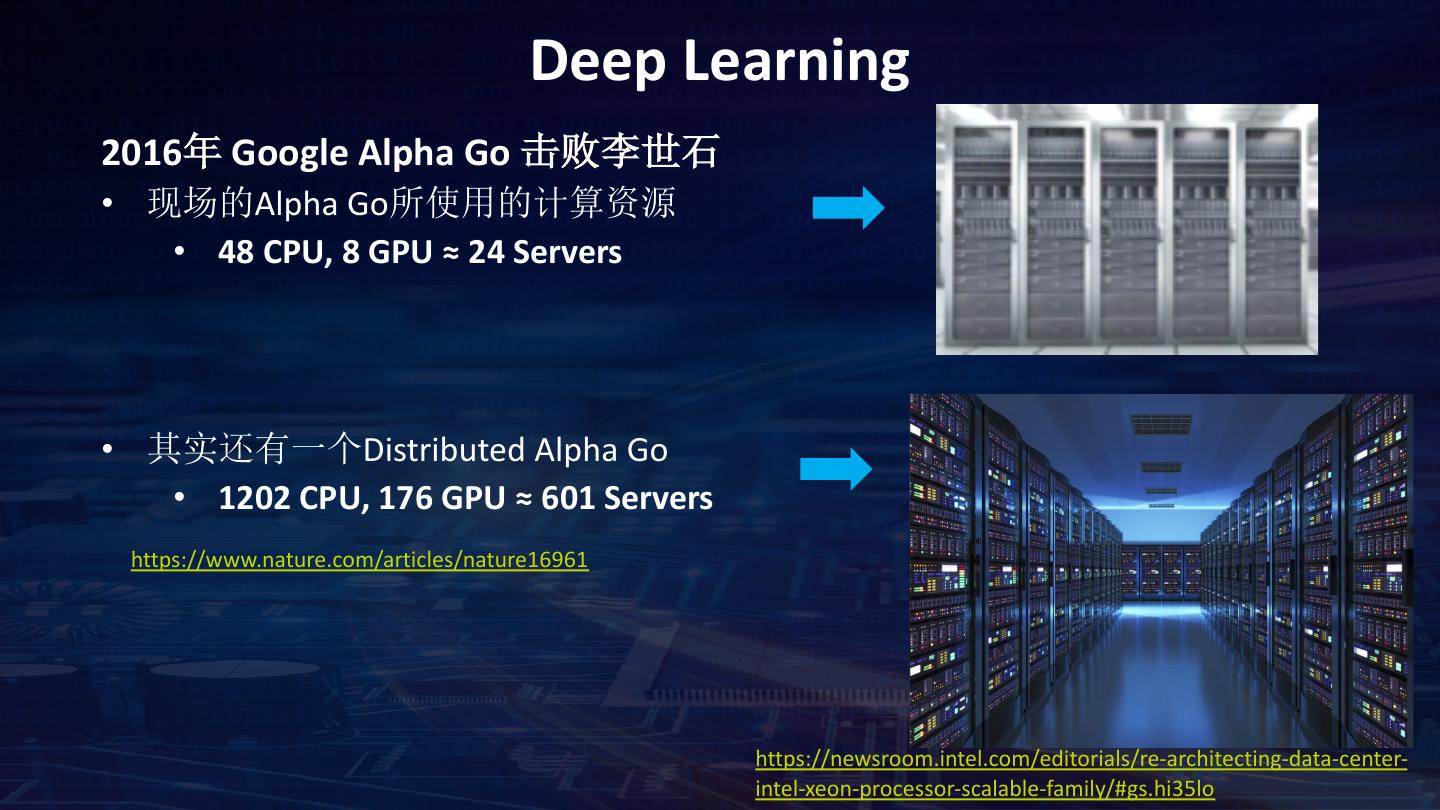 10 . Deep Learning 2016年 Google Alpha Go 击败李世石 • 现场的Alpha Go所使用的计算资源 • 48 CPU, 8 GPU ≈ 24 Servers • 其实还有一个Distributed Alpha Go • 1202 CPU, 176 GPU ≈ 601 Servers https://www.nature.com/articles/nature16961 https://newsroom.intel.com/editorials/re-architecting-data-center- intel-xeon-processor-scalable-family/#gs.hi35lo