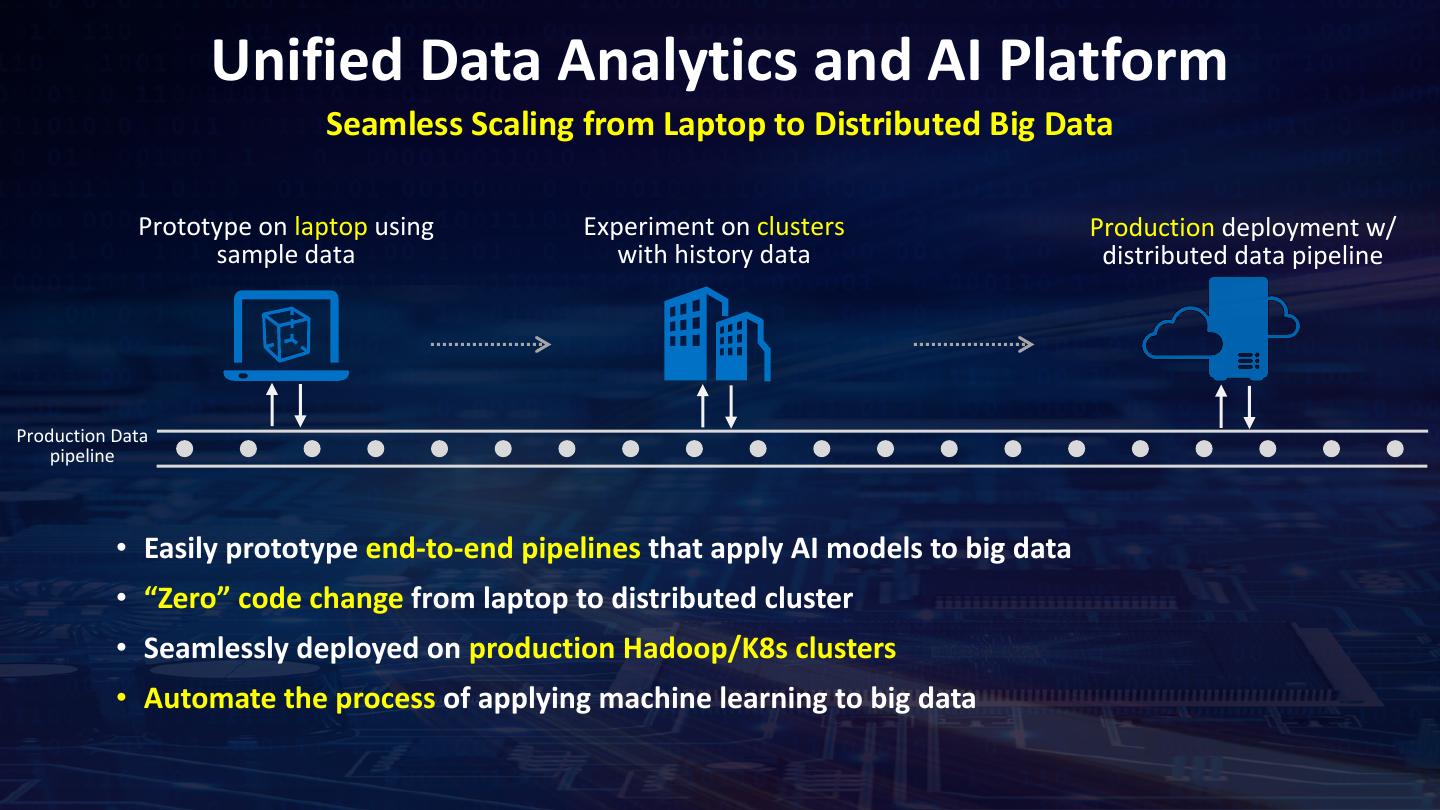 13 . Unified Data Analytics and AI Platform Seamless Scaling from Laptop to Distributed Big Data Prototype on laptop using Experiment on clusters Production deployment w/ sample data with history data distributed data pipeline Production Data pipeline • Easily prototype end-to-end pipelines that apply AI models to big data • “Zero” code change from laptop to distributed cluster • Seamlessly deployed on production Hadoop/K8s clusters • Automate the process of applying machine learning to big data