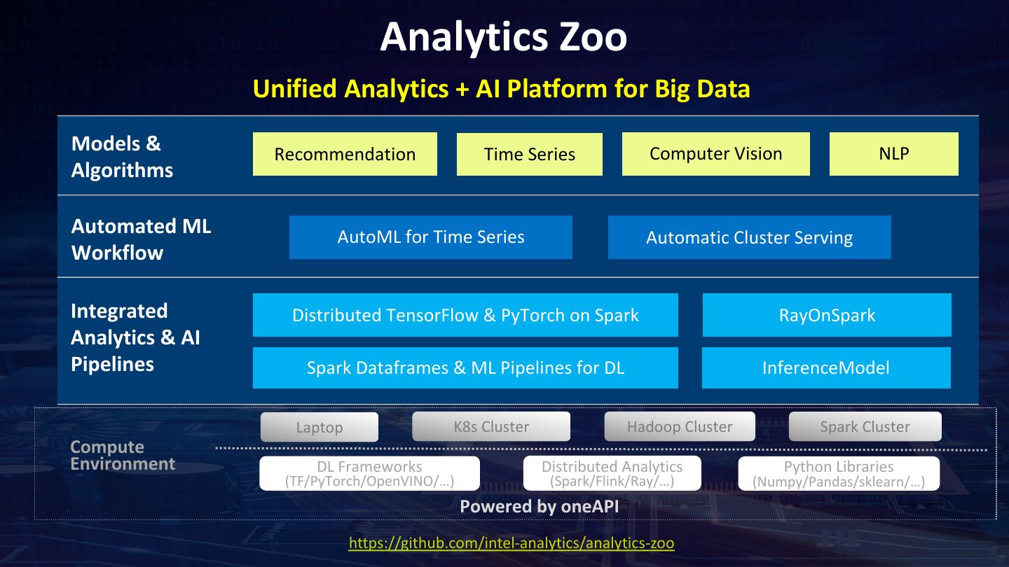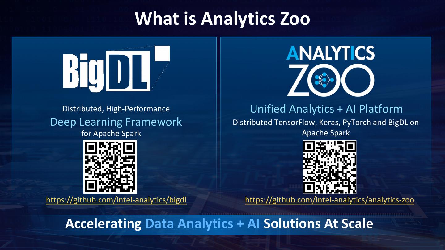 1 . What is Analytics Zoo Distributed, High-Performance Unified Analytics + AI Platform Deep Learning Framework Distributed TensorFlow, Keras, PyTorch and BigDL on for Apache Spark Apache Spark https://github.com/intel-analytics/bigdl https://github.com/intel-analytics/analytics-zoo Accelerating Data Analytics + AI Solutions At Scale