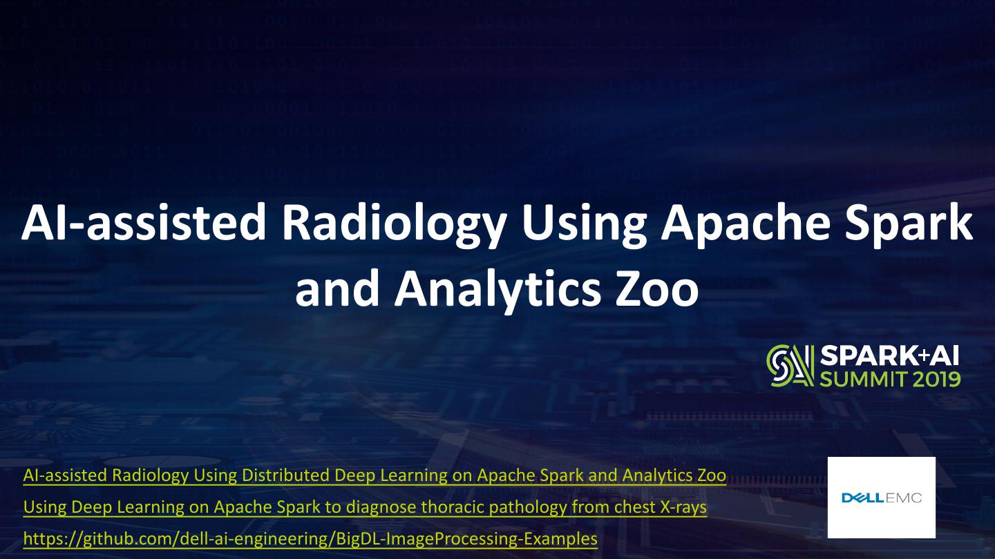 15 .AI-assisted Radiology Using Apache Spark and Analytics Zoo AI-assisted Radiology Using Distributed Deep Learning on Apache Spark and Analytics Zoo Using Deep Learning on Apache Spark to diagnose thoracic pathology from chest X-rays https://github.com/dell-ai-engineering/BigDL-ImageProcessing-Examples