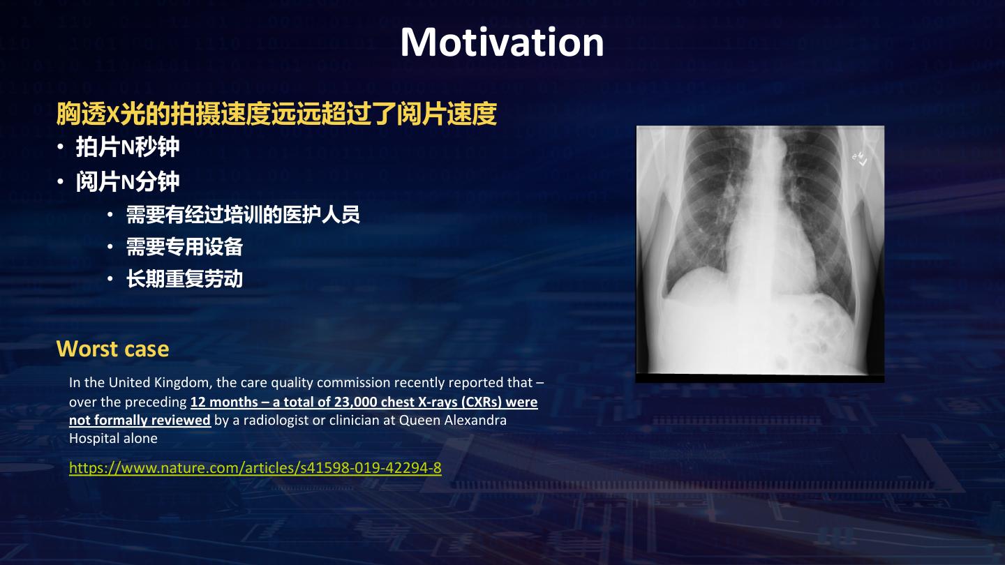 16 . Motivation 胸透X光的拍摄速度远远超过了阅片速度 • 拍片N秒钟 • 阅片N分钟 • 需要有经过培训的医护人员 • 需要专用设备 • 长期重复劳动 Worst case In the United Kingdom, the care quality commission recently reported that – over the preceding 12 months – a total of 23,000 chest X-rays (CXRs) were not formally reviewed by a radiologist or clinician at Queen Alexandra Hospital alone https://www.nature.com/articles/s41598-019-42294-8