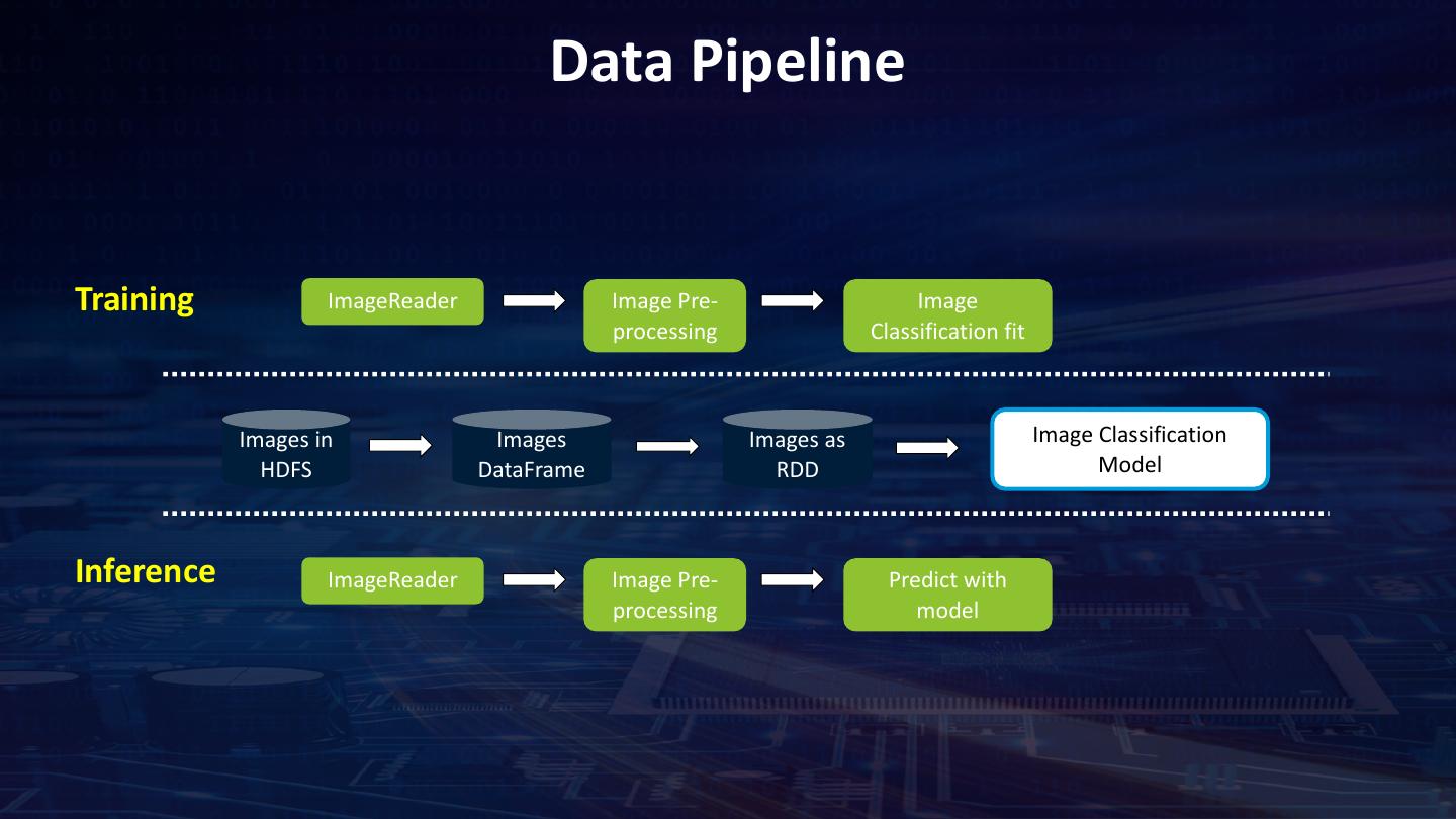 21 . Data Pipeline Training ImageReader Image Pre- Image processing Classification fit Images in Images Images as Image Classification HDFS DataFrame RDD Model Inference ImageReader Image Pre- Predict with processing model