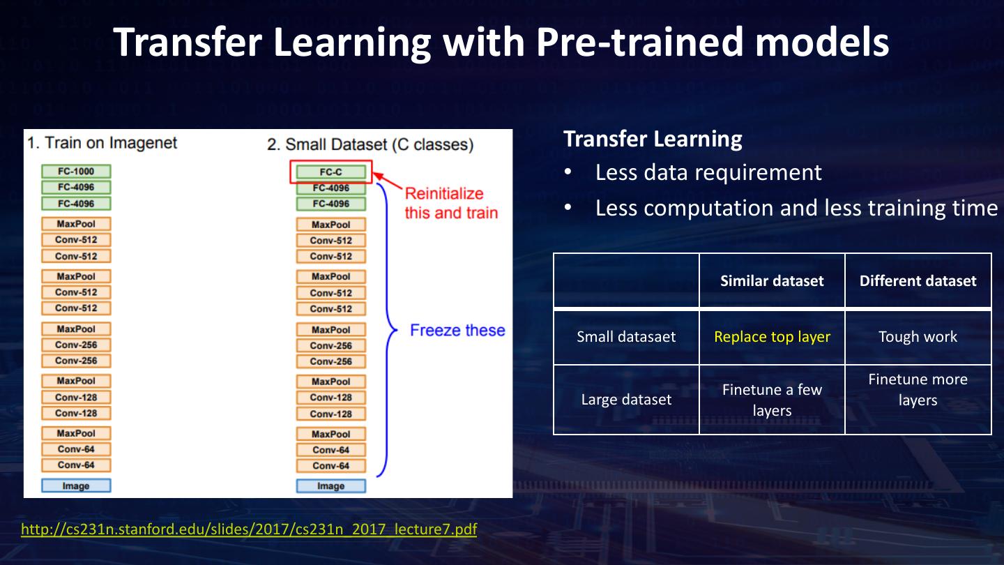23 . Transfer Learning with Pre-trained models Transfer Learning • Less data requirement • Less computation and less training time Similar dataset Different dataset Small datasaet Replace top layer Tough work Finetune more Finetune a few Large dataset layers layers http://cs231n.stanford.edu/slides/2017/cs231n_2017_lecture7.pdf