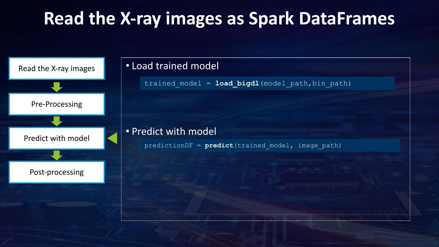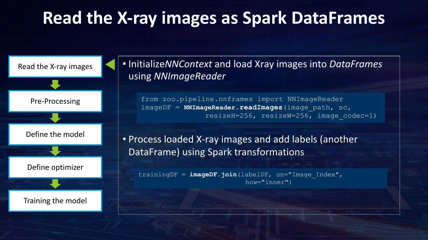25 . Read the X-ray images as Spark DataFrames Read the X-ray images • InitializeNNContext and load Xray images into DataFrames using NNImageReader Pre-Processing from zoo.pipeline.nnframes import NNImageReader imageDF = NNImageReader.readImages(image_path, sc, resizeH=256, resizeW=256, image_codec=1) Define the model • Process loaded X-ray images and add labels (another DataFrame) using Spark transformations Define optimizer trainingDF = imageDF.join(labelDF, on="Image_Index", how="inner") Training the model