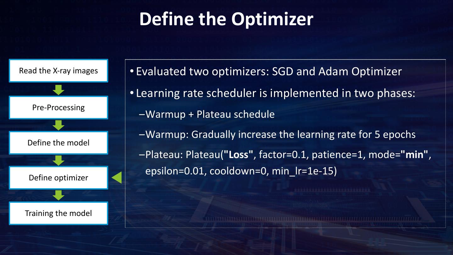 28 . Define the Optimizer Read the X-ray images • Evaluated two optimizers: SGD and Adam Optimizer • Learning rate scheduler is implemented in two phases: Pre-Processing –Warmup + Plateau schedule –Warmup: Gradually increase the learning rate for 5 epochs Define the model –Plateau: Plateau("Loss", factor=0.1, patience=1, mode="min", epsilon=0.01, cooldown=0, min_lr=1e-15) Define optimizer Training the model