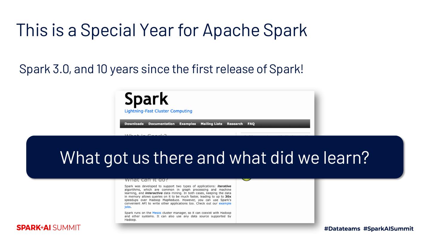 2 .This is a Special Year for Apache Spark Spark 3.0, and 10 years since the first release of Spark! What got us there and what did we learn?