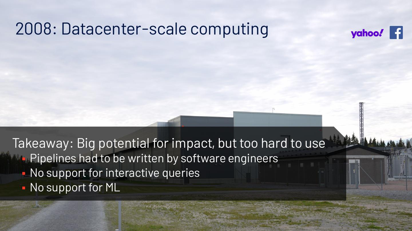 5 .2008: Datacenter-scale computing Takeaway: Big potential for impact, but too hard to use § Pipelines had to be written by software engineers § No support for interactive queries § No support for ML