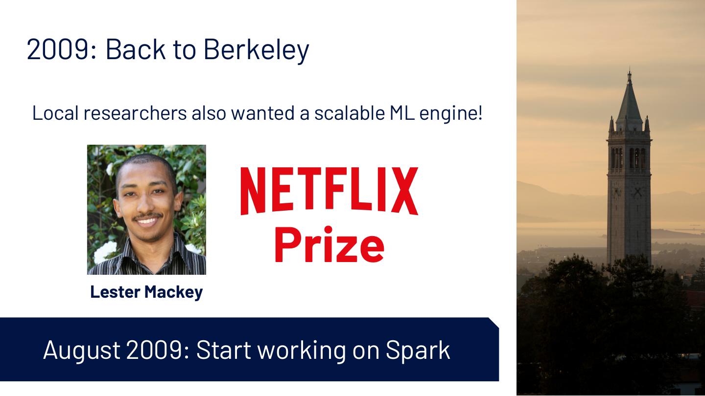 6 .2009: Back to Berkeley Local researchers also wanted a scalable ML engine! Prize Lester Mackey August 2009: Start working on Spark