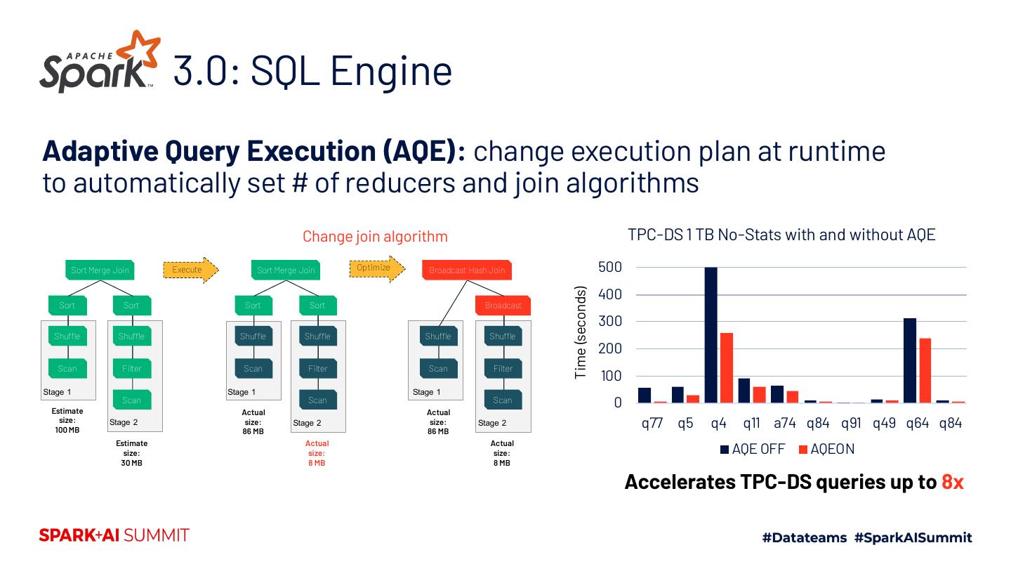 15 . 3.0: SQL Engine Adaptive Query Execution (AQE): change execution plan at runtime to automatically set # of reducers and join algorithms Users tune # of reducers in 60% of clusters!
