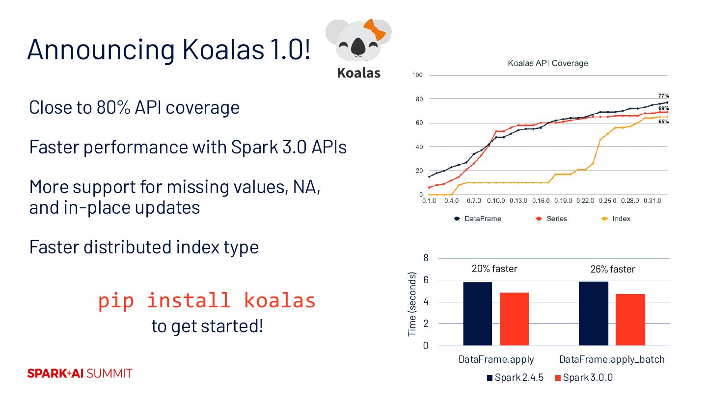 26 .Announcing Koalas 1.0! Close to 80% API coverage Faster performance with Spark 3.0 APIs More support for missing values, NA, and in-place updates Faster distributed index type 8 20% faster 26% faster Time (seconds) 6 pip install koalas 4 to get started! 2 0 DataFrame.apply DataFrame.apply_batch Spark 2.4.5 Spark 3.0.0