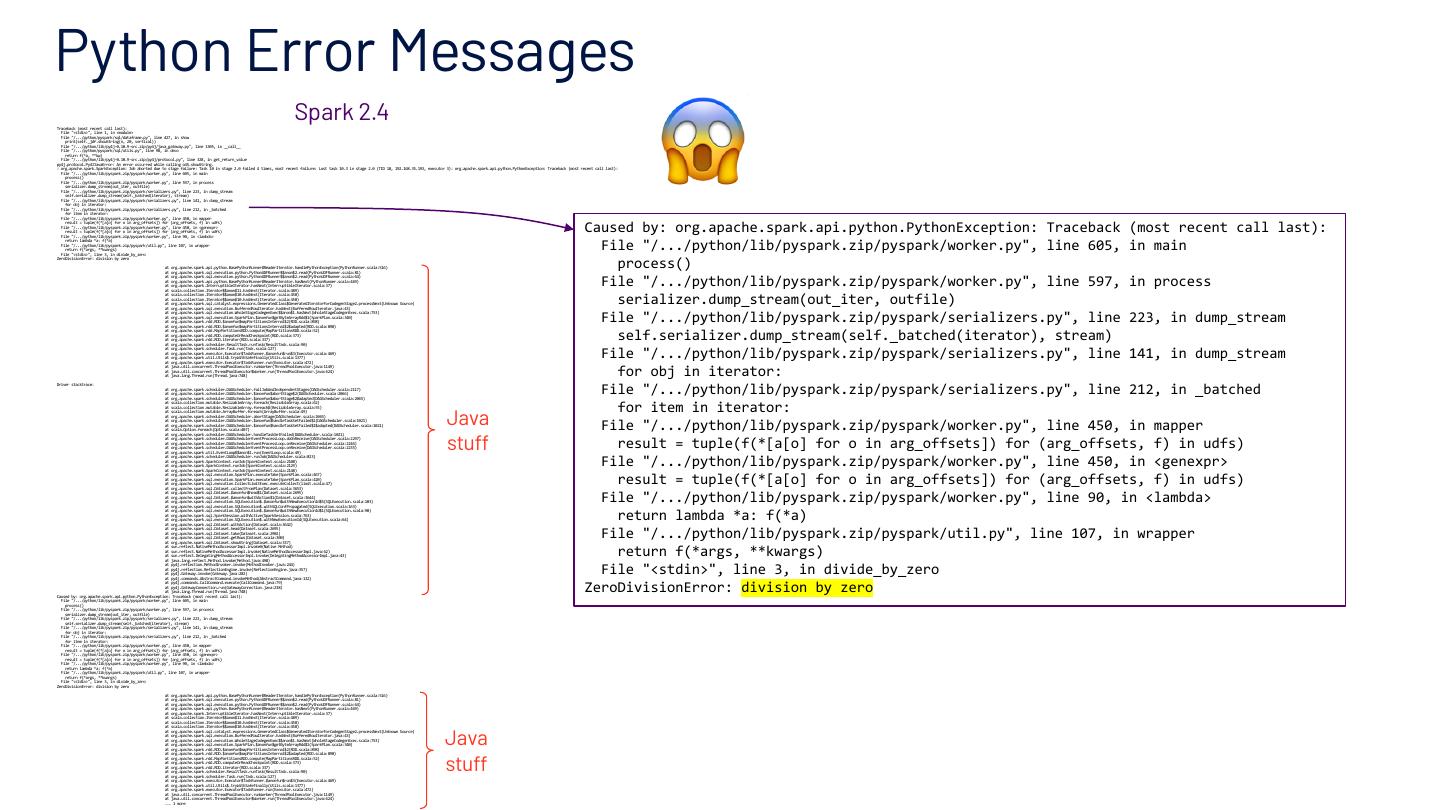 29 .Python Error Messages 😱 Traceback (most recent call last): Spark 2.4 File "<stdin>", line 1, in <module> File "/.../python/pyspark/sql/dataframe.py", line 427, in show print(self._jdf.showString(n, 20, vertical)) File "/.../python/lib/py4j-0.10.9-src.zip/py4j/java_gateway.py", line 1305, in __call__ File "/.../python/pyspark/sql/utils.py", line 98, in deco return f(*a, **kw) File "/.../python/lib/py4j-0.10.9-src.zip/py4j/protocol.py", line 328, in get_return_value py4j.protocol.Py4JJavaError: An error occurred while calling o45.showString. : org.apache.spark.SparkException: Job aborted due to stage failure: Task 10 in stage 2.0 failed 4 times, most recent failure: Lost task 10.3 in stage 2.0 (TID 18, 192.168.35.193, executor 3): org.apache.spark.api.python.PythonException: Traceback (most recent call last): File "/.../python/lib/pyspark.zip/pyspark/worker.py", line 605, in main process() File "/.../python/lib/pyspark.zip/pyspark/worker.py", line 597, in process serializer.dump_stream(out_iter, outfile) File "/.../python/lib/pyspark.zip/pyspark/serializers.py", line 223, in dump_stream self.serializer.dump_stream(self._batched(iterator), stream) File "/.../python/lib/pyspark.zip/pyspark/serializers.py", line 141, in dump_stream for obj in iterator: File "/.../python/lib/pyspark.zip/pyspark/serializers.py", line 212, in _batched for item in iterator: File "/.../python/lib/pyspark.zip/pyspark/worker.py", line 450, in mapper Caused by: org.apache.spark.api.python.PythonException: Traceback (most recent call last): result = tuple(f(*[a[o] for o in arg_offsets]) for (arg_offsets, f) in udfs) File "/.../python/lib/pyspark.zip/pyspark/worker.py", line 450, in <genexpr> result = tuple(f(*[a[o] for o in arg_offsets]) for (arg_offsets, f) in udfs) File "/.../python/lib/pyspark.zip/pyspark/worker.py", line 90, in <lambda> File "/.../python/lib/pyspark.zip/pyspark/worker.py", line 605, in main return lambda *a: f(*a) File "/.../python/lib/pyspark.zip/pyspark/util.py", line 107, in wrapper return f(*args, **kwargs) File "<stdin>", line 3, in divide_by_zero process() ZeroDivisionError: division by zero at org.apache.spark.api.python.BasePythonRunner$ReaderIterator.handlePythonException(PythonRunner.scala:516) at org.apache.spark.sql.execution.python.PythonUDFRunner$$anon$2.read(PythonUDFRunner.scala:81) File "/.../python/lib/pyspark.zip/pyspark/worker.py", line 597, in process at org.apache.spark.sql.execution.python.PythonUDFRunner$$anon$2.read(PythonUDFRunner.scala:64) at org.apache.spark.api.python.BasePythonRunner$ReaderIterator.hasNext(PythonRunner.scala:469) at org.apache.spark.InterruptibleIterator.hasNext(InterruptibleIterator.scala:37) at scala.collection.Iterator$$anon$11.hasNext(Iterator.scala:489) serializer.dump_stream(out_iter, outfile) at scala.collection.Iterator$$anon$10.hasNext(Iterator.scala:458) at scala.collection.Iterator$$anon$10.hasNext(Iterator.scala:458) at org.apache.spark.sql.catalyst.expressions.GeneratedClass$GeneratedIteratorForCodegenStage2.processNext(Unknown Source) at org.apache.spark.sql.execution.BufferedRowIterator.hasNext(BufferedRowIterator.java:43) File "/.../python/lib/pyspark.zip/pyspark/serializers.py", line 223, in dump_stream at org.apache.spark.sql.execution.WholeStageCodegenExec$$anon$1.hasNext(WholeStageCodegenExec.scala:753) at org.apache.spark.sql.execution.SparkPlan.$anonfun$getByteArrayRdd$1(SparkPlan.scala:340) at org.apache.spark.rdd.RDD.$anonfun$mapPartitionsInternal$2(RDD.scala:898) at org.apache.spark.rdd.RDD.$anonfun$mapPartitionsInternal$2$adapted(RDD.scala:898) self.serializer.dump_stream(self._batched(iterator), stream) at org.apache.spark.rdd.MapPartitionsRDD.compute(MapPartitionsRDD.scala:52) at org.apache.spark.rdd.RDD.computeOrReadCheckpoint(RDD.scala:373) at org.apache.spark.rdd.RDD.iterator(RDD.scala:337) at org.apache.spark.scheduler.ResultTask.runTask(ResultTask.scala:90) File "/.../python/lib/pyspark.zip/pyspark/serializers.py", line 141, in dump_stream at org.apache.spark.scheduler.Task.run(Task.scala:127) at org.apache.spark.executor.Executor$TaskRunner.$anonfun$run$3(Executor.scala:469) at org.apache.spark.util.Utils$.tryWithSafeFinally(Utils.scala:1377) at org.apache.spark.executor.Executor$TaskRunner.run(Executor.scala:472) for obj in iterator: at java.util.concurrent.ThreadPoolExecutor.runWorker(ThreadPoolExecutor.java:1149) at java.util.concurrent.ThreadPoolExecutor$Worker.run(ThreadPoolExecutor.java:624) at java.lang.Thread.run(Thread.java:748) File "/.../python/lib/pyspark.zip/pyspark/serializers.py", line 212, in _batched Driver stacktrace: at org.apache.spark.scheduler.DAGScheduler.failJobAndIndependentStages(DAGScheduler.scala:2117) at org.apache.spark.scheduler.DAGScheduler.$anonfun$abortStage$2(DAGScheduler.scala:2066) at org.apache.spark.scheduler.DAGScheduler.$anonfun$abortStage$2$adapted(DAGScheduler.scala:2065) for item in iterator: at scala.collection.mutable.ResizableArray.foreach(ResizableArray.scala:62) Java at scala.collection.mutable.ResizableArray.foreach$(ResizableArray.scala:55) at scala.collection.mutable.ArrayBuffer.foreach(ArrayBuffer.scala:49) at org.apache.spark.scheduler.DAGScheduler.abortStage(DAGScheduler.scala:2065) File "/.../python/lib/pyspark.zip/pyspark/worker.py", line 450, in mapper at org.apache.spark.scheduler.DAGScheduler.$anonfun$handleTaskSetFailed$1(DAGScheduler.scala:1021) at org.apache.spark.scheduler.DAGScheduler.$anonfun$handleTaskSetFailed$1$adapted(DAGScheduler.scala:1021) at scala.Option.foreach(Option.scala:407) stuff at org.apache.spark.scheduler.DAGScheduler.handleTaskSetFailed(DAGScheduler.scala:1021) result = tuple(f(*[a[o] for o in arg_offsets]) for (arg_offsets, f) in udfs) at org.apache.spark.scheduler.DAGSchedulerEventProcessLoop.doOnReceive(DAGScheduler.scala:2297) at org.apache.spark.scheduler.DAGSchedulerEventProcessLoop.onReceive(DAGScheduler.scala:2246) at org.apache.spark.scheduler.DAGSchedulerEventProcessLoop.onReceive(DAGScheduler.scala:2235) at org.apach