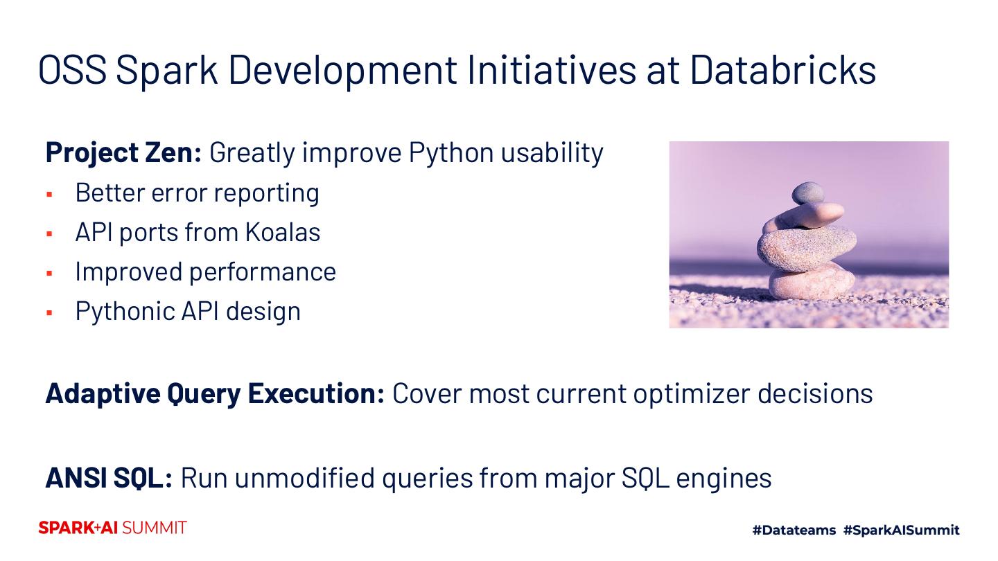 28 .OSS Spark Development Initiatives at Databricks Project Zen: Greatly improve Python usability ▪ Better error reporting ▪ API ports from Koalas ▪ Improved performance ▪ Pythonic API design Adaptive Query Execution: Cover most current optimizer decisions ANSI SQL: Run unmodified queries from major SQL engines