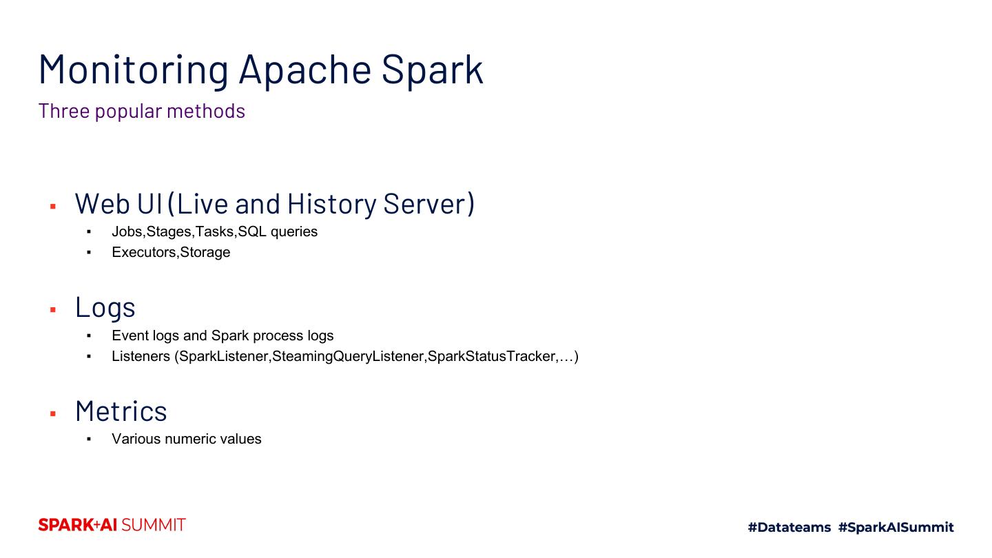 4 .Monitoring Apache Spark Three popular methods ▪ Web UI (Live and History Server) ▪ Jobs,Stages,Tasks,SQL queries ▪ Executors,Storage ▪ Logs ▪ Event logs and Spark process logs ▪ Listeners (SparkListener,SteamingQueryListener,SparkStatusTracker,…) ▪ Metrics ▪ Various numeric values