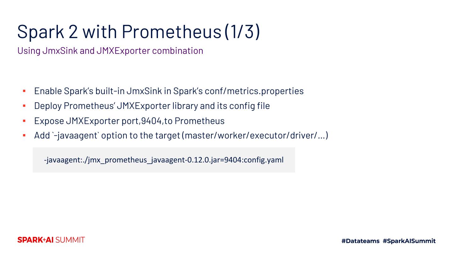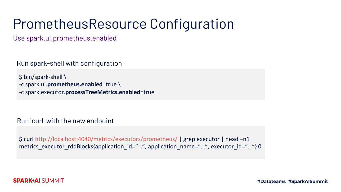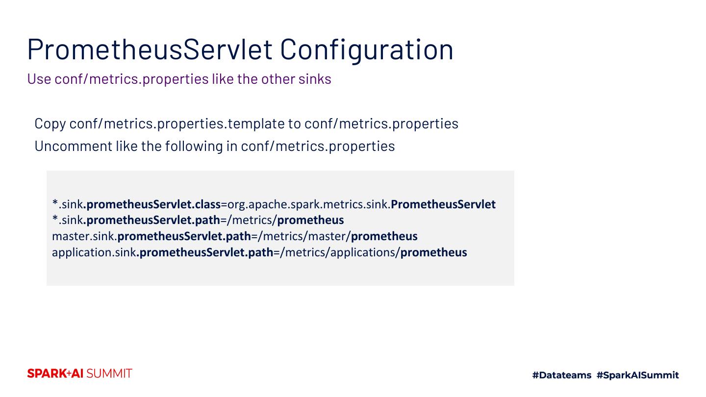 20 .PrometheusServlet Configuration Use conf/metrics.properties like the other sinks Copy conf/metrics.properties.template to conf/metrics.properties Uncomment like the following in conf/metrics.properties *.sink.prometheusServlet.class=org.apache.spark.metrics.sink.PrometheusServlet *.sink.prometheusServlet.path=/metrics/prometheus master.sink.prometheusServlet.path=/metrics/master/prometheus application.sink.prometheusServlet.path=/metrics/applications/prometheus
