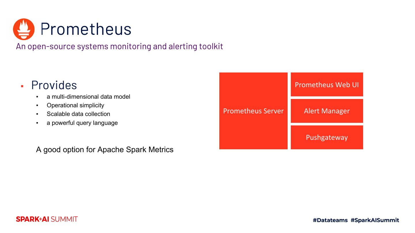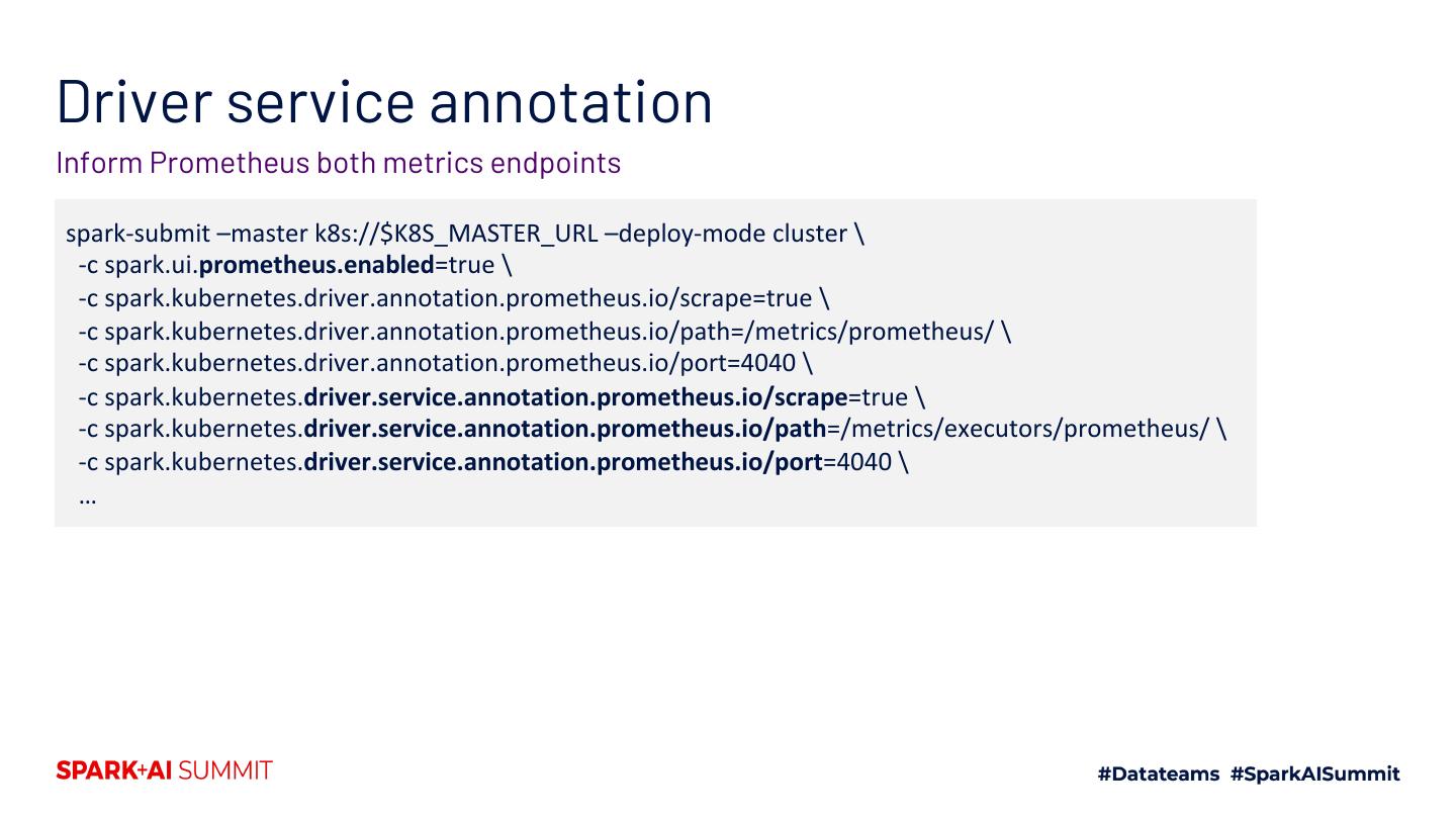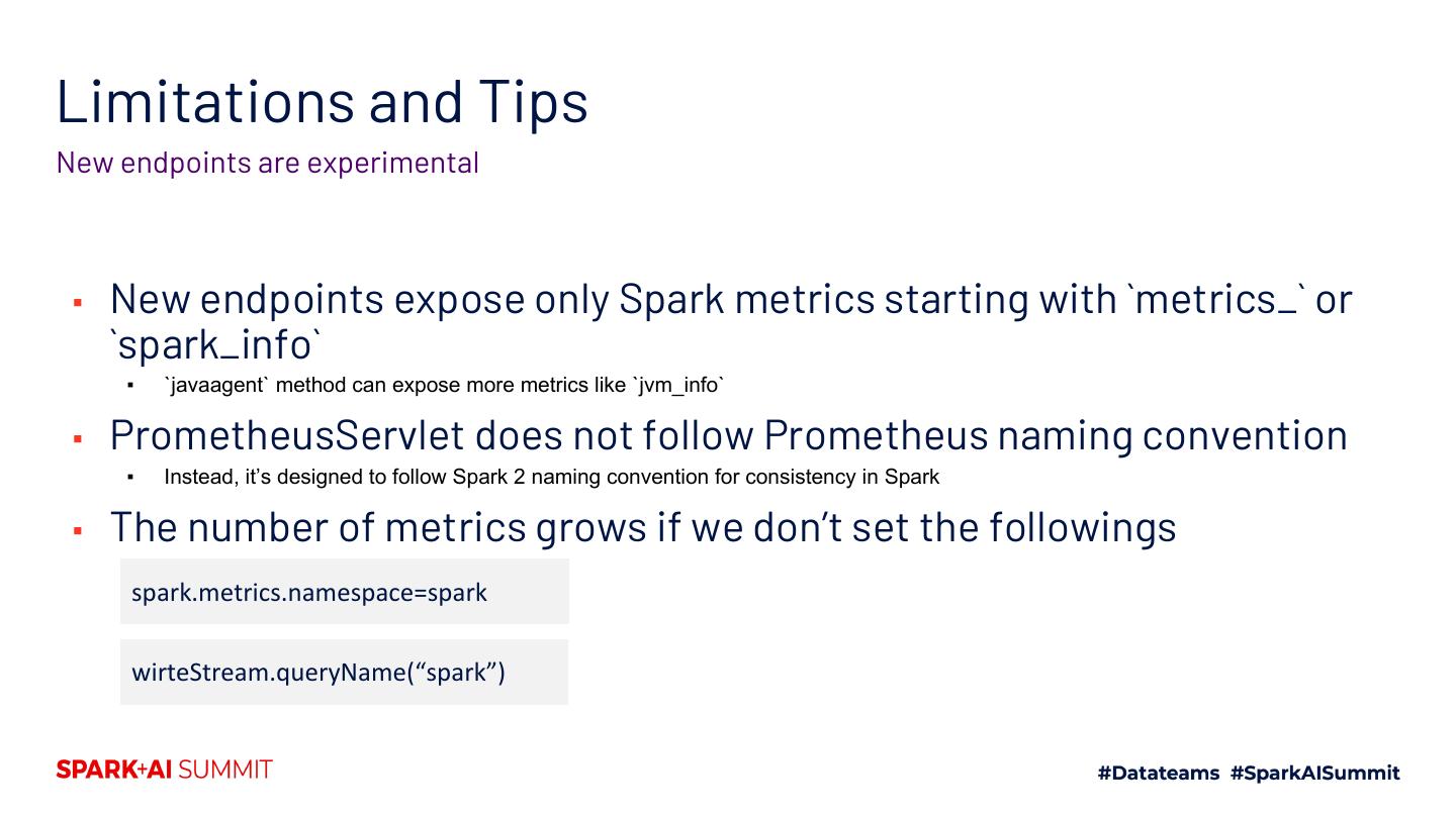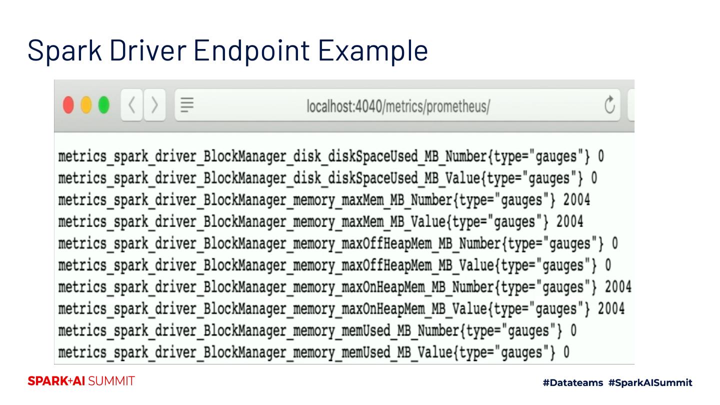 20 .PrometheusServlet Configuration Use conf/metrics.properties like the other sinks Copy conf/metrics.properties.template to conf/metrics.properties Uncomment like the following in conf/metrics.properties *.sink.prometheusServlet.class=org.apache.spark.metrics.sink.PrometheusServlet *.sink.prometheusServlet.path=/metrics/prometheus master.sink.prometheusServlet.path=/metrics/master/prometheus application.sink.prometheusServlet.path=/metrics/applications/prometheus