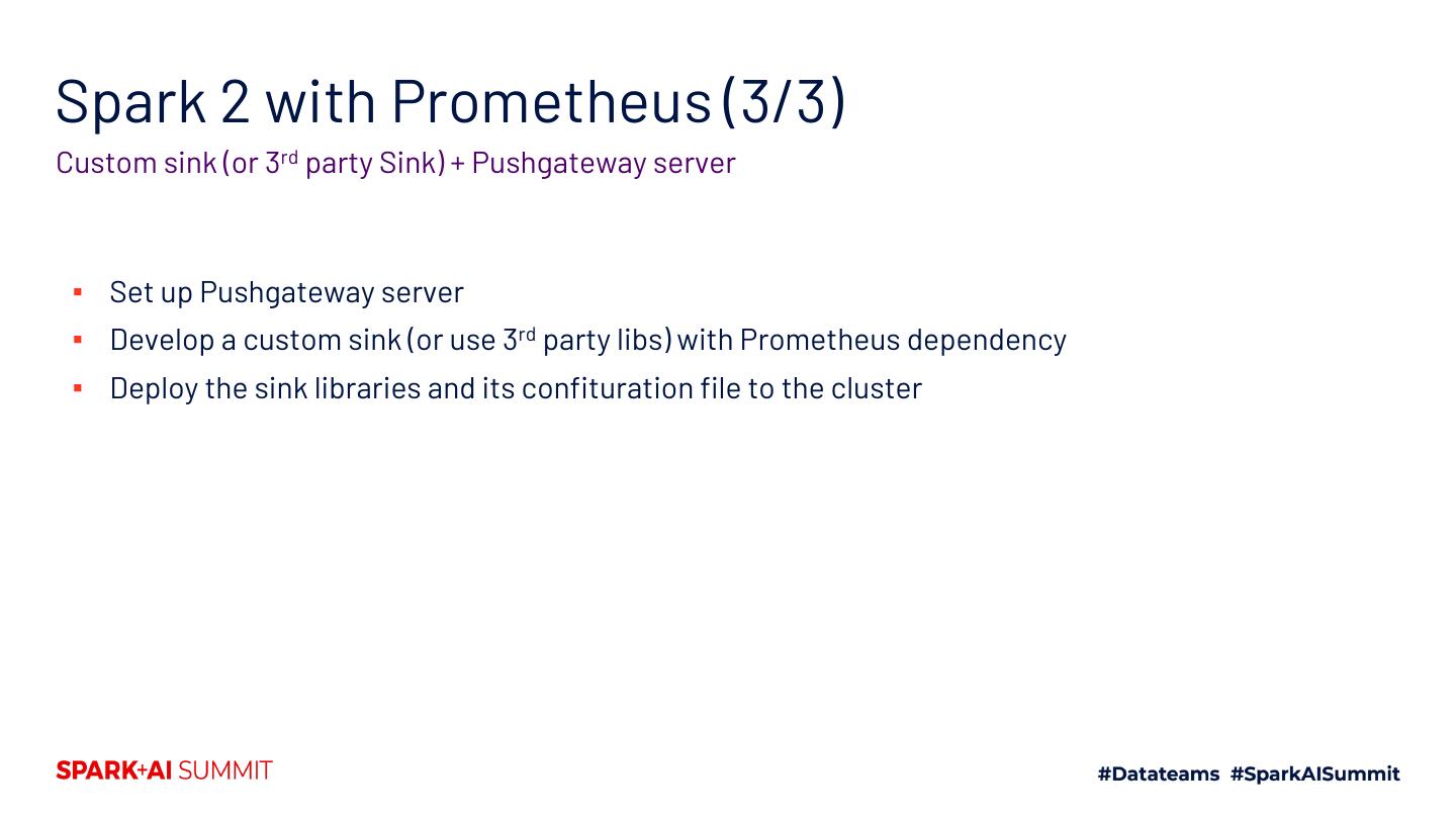 9 .Spark 2 with Prometheus (3/3) Custom sink (or 3rd party Sink) + Pushgateway server ▪ Set up Pushgateway server ▪ Develop a custom sink (or use 3rd party libs) with Prometheus dependency ▪ Deploy the sink libraries and its confituration file to the cluster