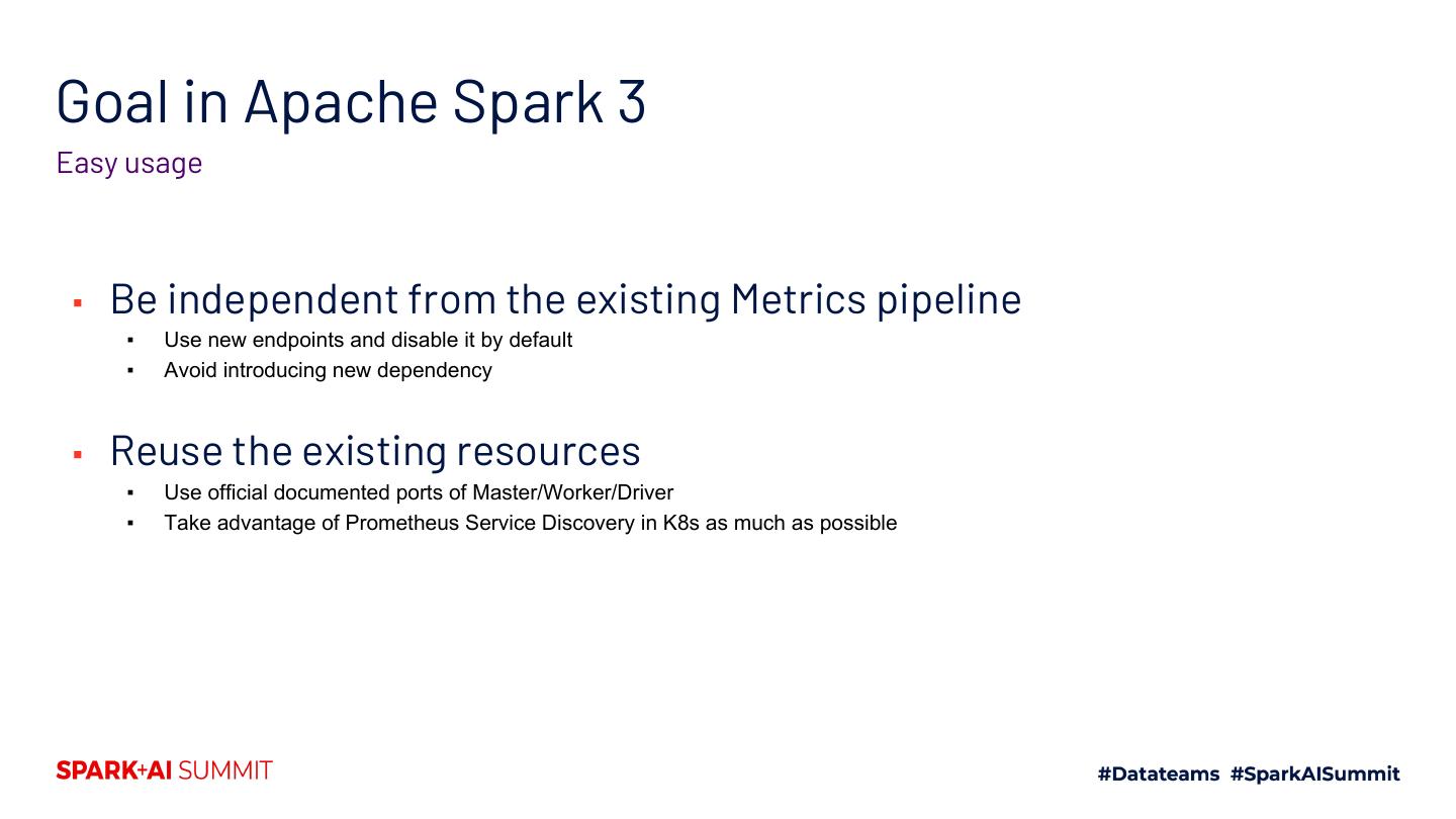 11 .Goal in Apache Spark 3 Easy usage ▪ Be independent from the existing Metrics pipeline ▪ Use new endpoints and disable it by default ▪ Avoid introducing new dependency ▪ Reuse the existing resources ▪ Use official documented ports of Master/Worker/Driver ▪ Take advantage of Prometheus Service Discovery in K8s as much as possible
